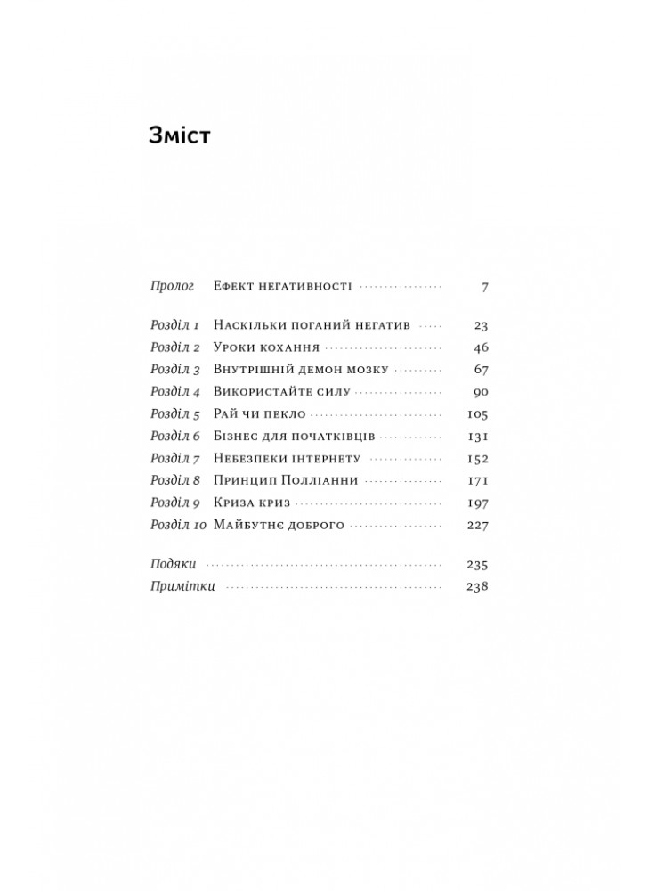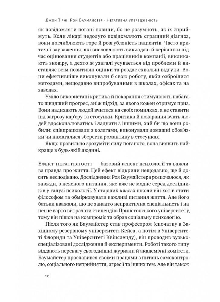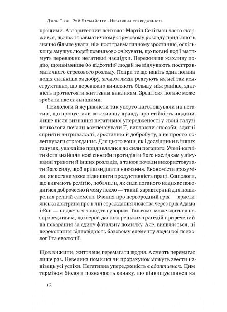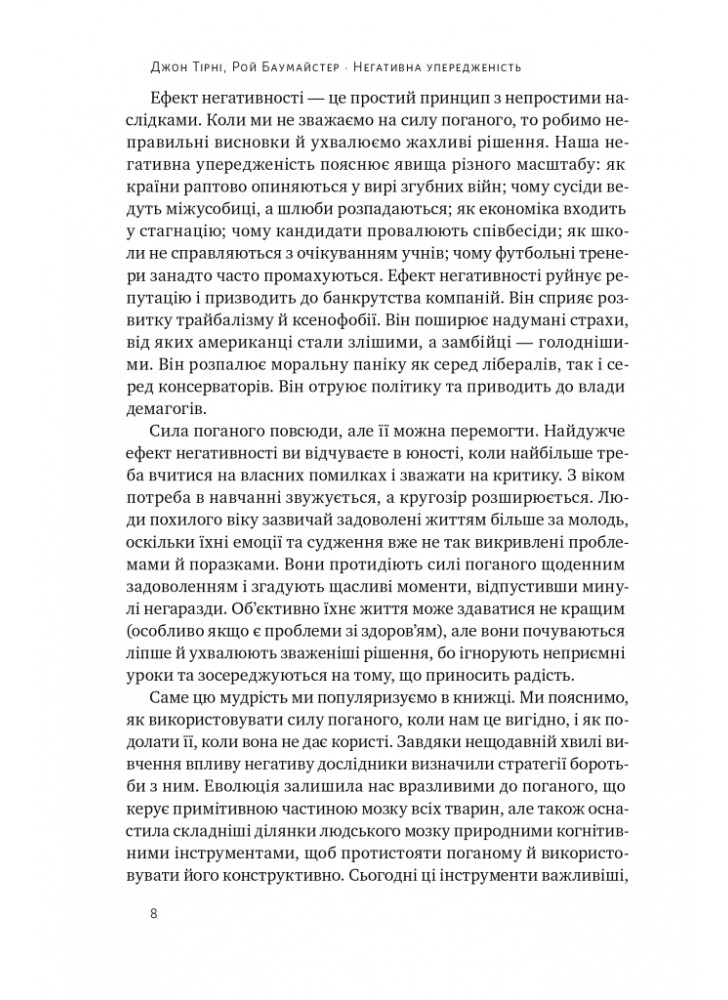 Але як тільки ми визнаємо нашу негативну упередженість, раціональний мозок зможе подолати силу поганого, коли воно шкідливе, і використовувати цю силу, коли це корисно. Насправді, погані розриви та погані відчуття створюють найпотужніші стимули стати розумнішими та сильнішими. При правильному розумінні погане можна використати в абсолютно добре. Як зазначають науковий журналіст Джон Тірні та Баумайстер у цій обширній книзі, ми можемо прийняти перевірені стратегії, щоб уникнути пасток, які прирікають стосунки, кар’єру, бізнес і нації. Замість того, щоб впадати у відчай у тому, що не так у вашому житті й у світі, ви можете побачити, наскільки все йде правильно — і як зробити це ще краще.