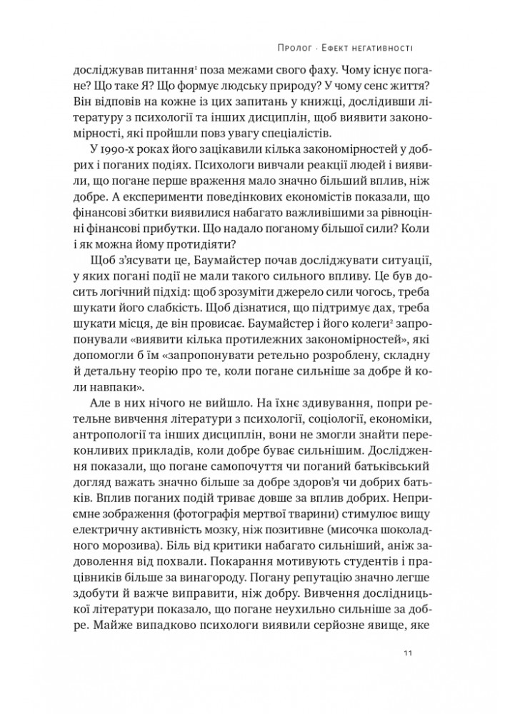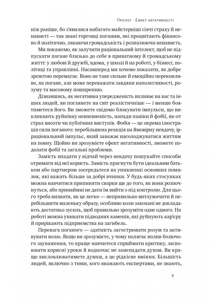 Чому нас спустошують слова критики, навіть якщо вони змішані зі щедрою похвалою? Тому що наш мозок сконцентрований на поганому. Цей негативний ефект пояснює велике і мале: чому країни впадають у катастрофічні війни, чому пари розлучаються, чому люди пропускають співбесіди на роботу, чому футбольні тренери тупо кидаються на четверте місце. Протягом усього дня сила поганого керує настроєм людей, стимулює маркетингові кампанії та домінує в новинах та політиці.