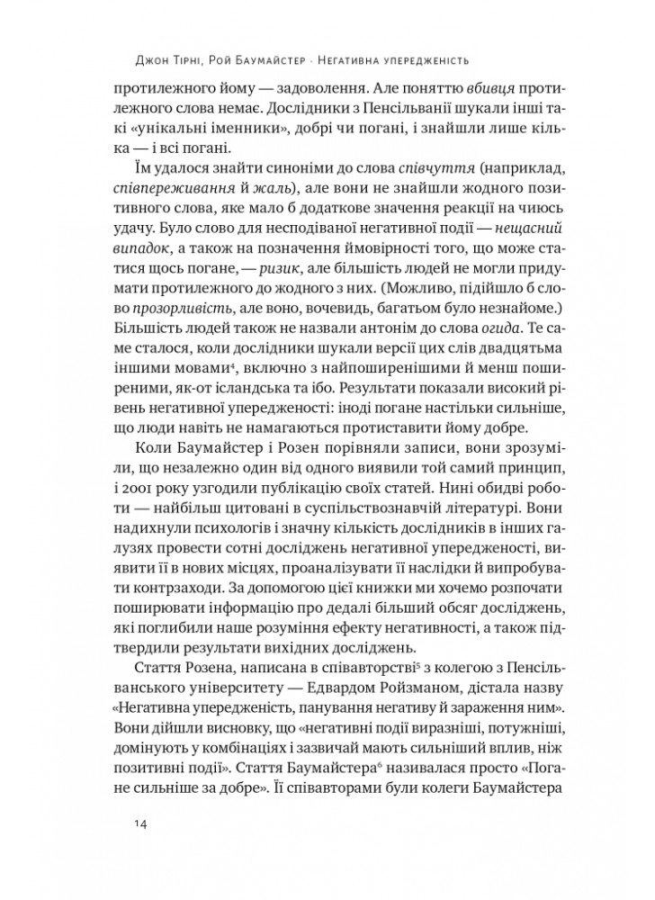 Видатний суспільствознавець Рой Баумайстер несподівано натрапив на цей фундаментальний аспект людської природи. Щоб з’ясувати, чому фінансові втрати важливіші для людей, ніж фінансові вигоди, Баумайстер шукав ситуації, в яких хороші події мали більший вплив, ніж погані. Але його команда не знайшла жодного. Їхнє дослідження показало, що погане невпинно сильніше за добре, і їх стаття стала однією з найбільш цитованих у науковій літературі. Негативне упередження нашого мозку має еволюційний сенс, оскільки воно тримало наших предків напоготові до фатальних небезпек, але воно спотворює нашу перспективу в сучасному медіа-середовищі. Безперервний шквал поганих новин і розпалювання криз змушує нас почувати себе безпорадними і змушує нас боятися і злитися. Ми ігноруємо наші численні благословення, воліючи прислухатися до голосів, які говорять нам, що світ піде до пекла.