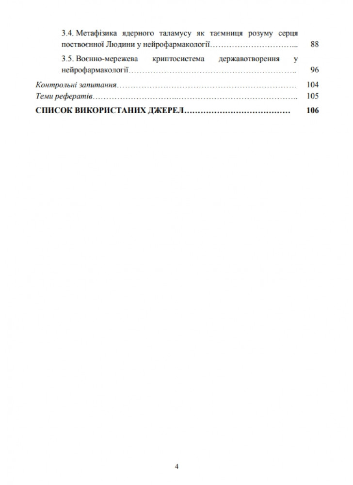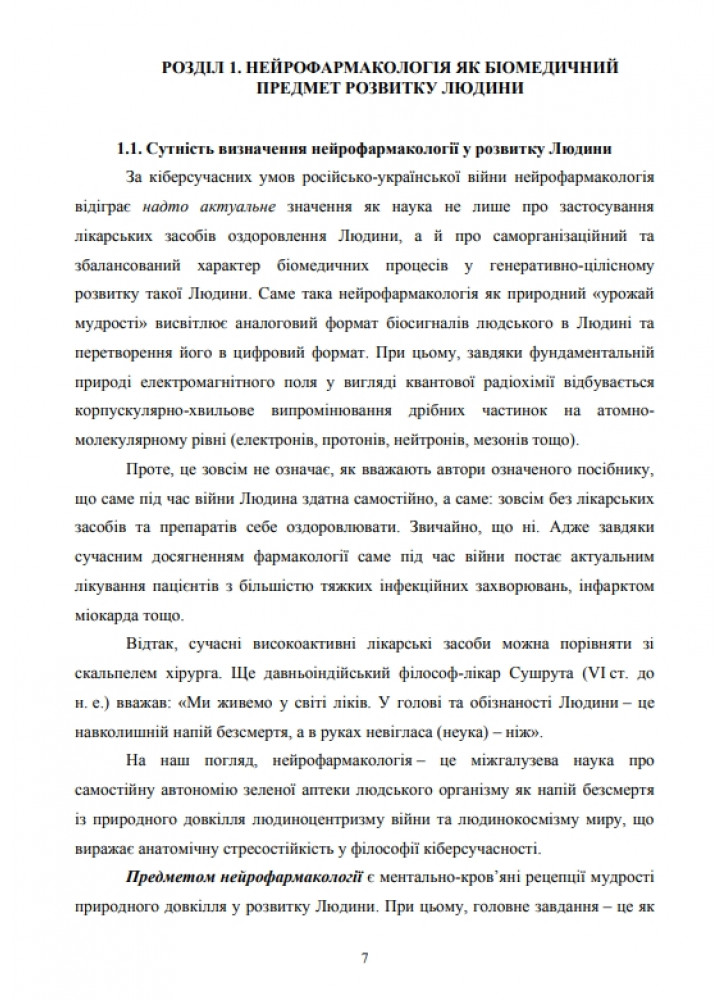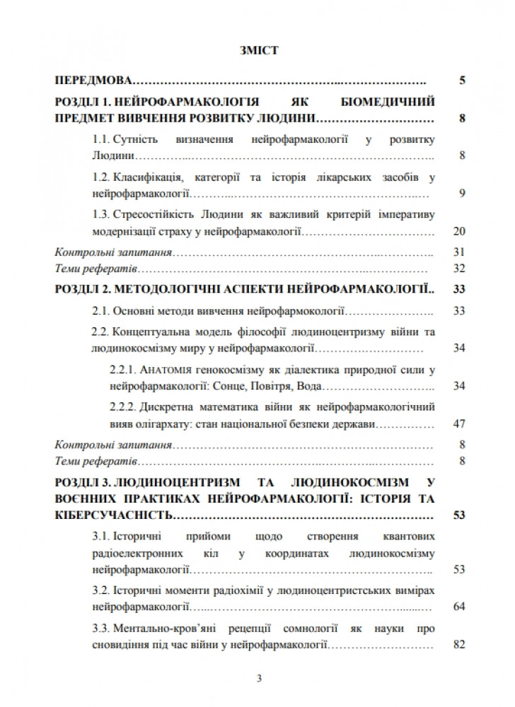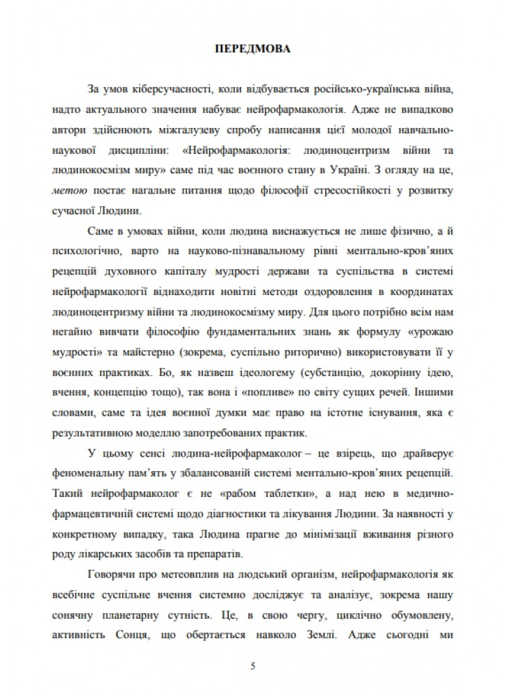 У навчальному посібнику розглянуто актуальні питання нейрофармакології у координатах людиноцентризму війни та людинокосмізму миру. Окреме місце в сучасній кіберінфраструктурі нейрофармакології посідають ментально-кров’яні рецепції сновидіння під час війни. Висвітлено нове авторське бачення щодо нейророзвитку Людини як планового виробництва у ній власної «зеленої аптеки».