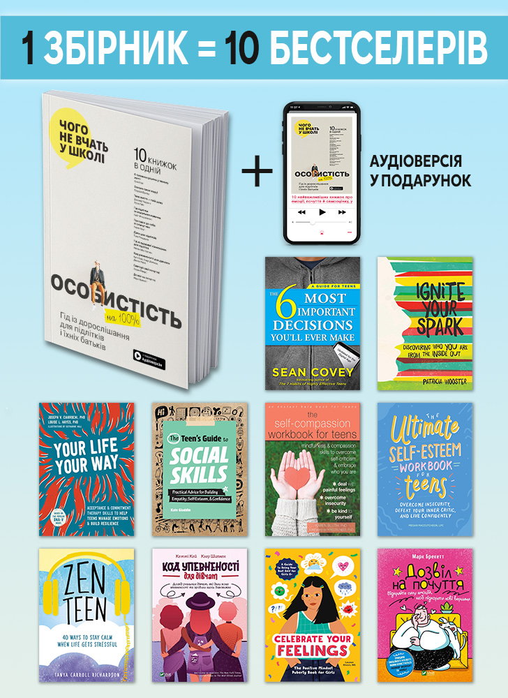 Підлітковий вік — це час рішень, що визначають усе майбутнє. Як допомогти дитині знайти себе, навчитися керувати емоціями та впевнено крокувати в доросле життя? Збірник самарі «Особистість на 100%» об’єднує десять світових бестселерів, які навчають підлітків відповідальності, емоційній грамотності, соціальним навичкам і впевненості у собі. Підлітковий вік — складний, але надзвичайно важливий період у житті кожної людини. За кілька років юна особистість має визначити, хто вона, у що вірить, чого прагне і як хоче будувати своє життя.