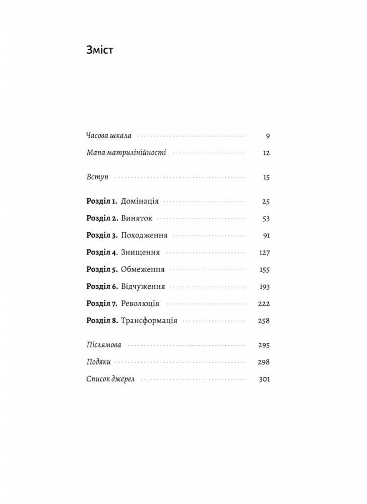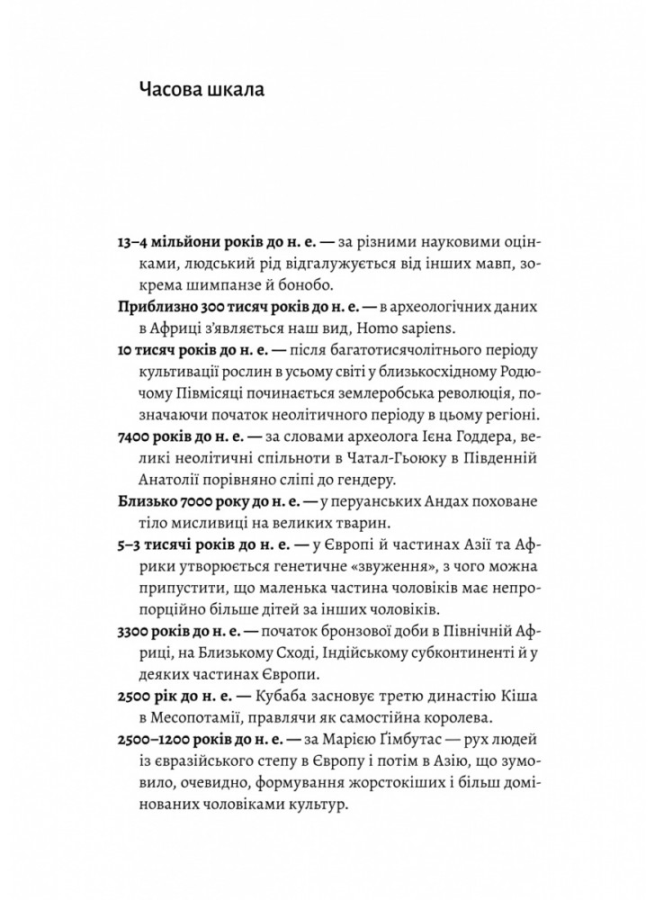 - Опираючись на дослідження археології, антропології та стародавньої історії, авторка доводить, що ні гендерна рівність, ні патріархат не є чимось заздалегідь визначеним.