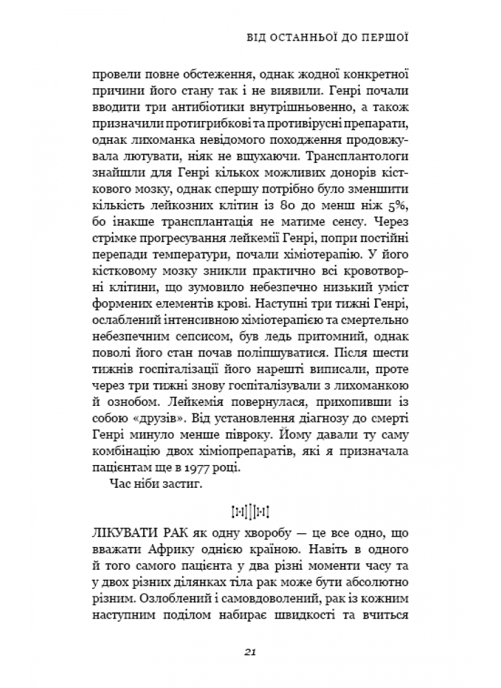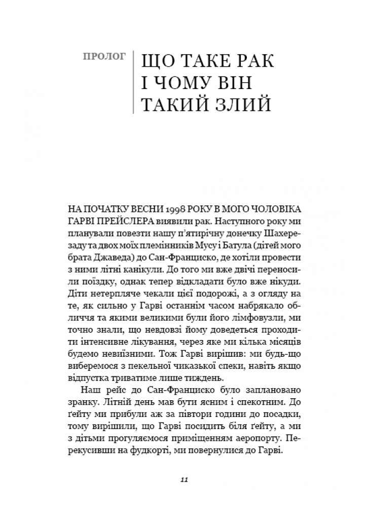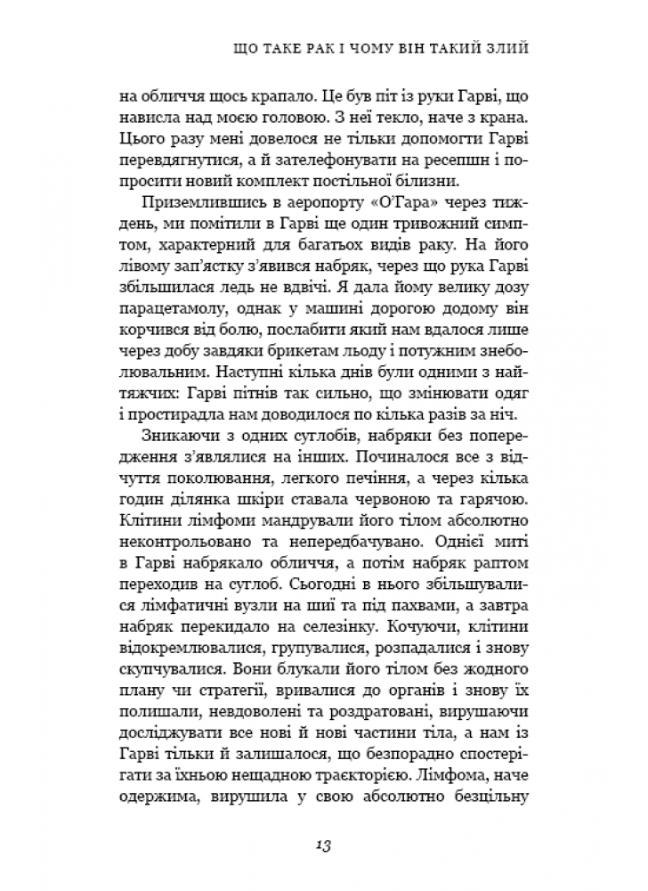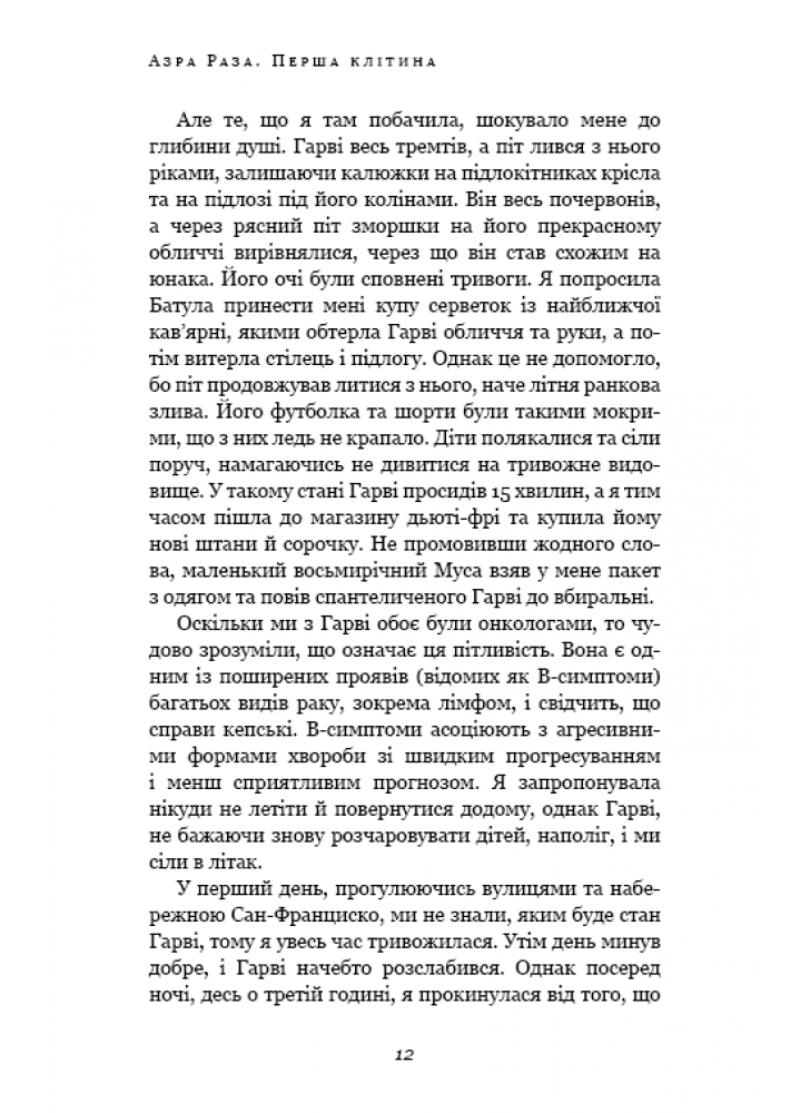 Проте авторка впевнена: варто змінити таке сприйняття онкології, а відтак змінити й підходи до її дослідження, лікування та співжиття з нею. Азра Раза розповідає про те, як вона змушена була взяти на себе страшний тягар і стати лікарем коханого чоловіка, коли він помирав від лейкемії.