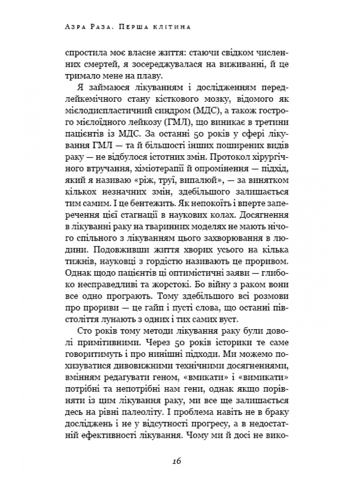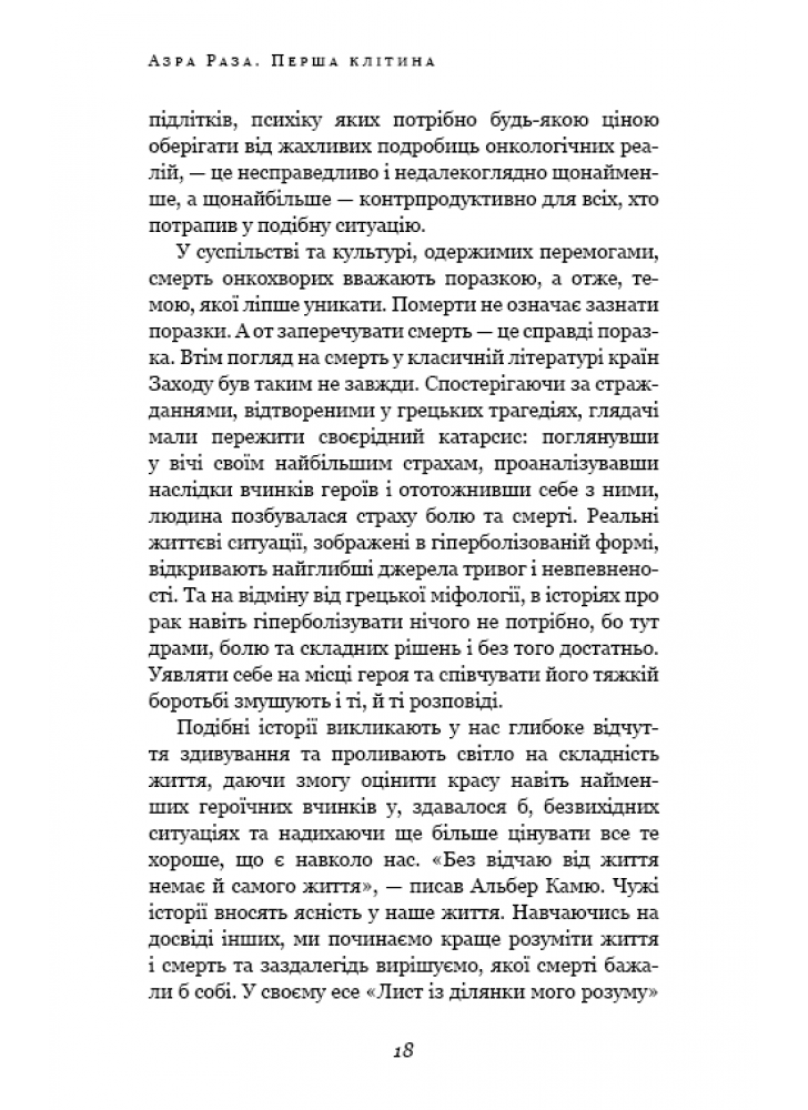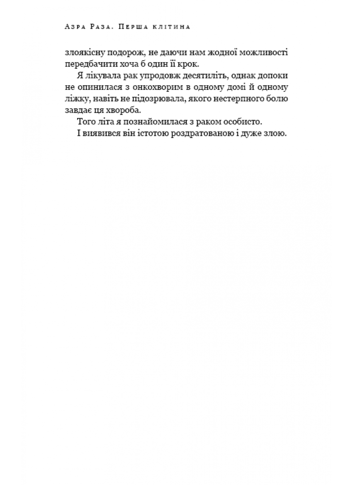 Азра Раза — лікарка-онколог Медичного центру Колумбійського університету (США), дослідниця й письменниця. У своїй книзі вона відверто говорить про рак, розглядаючи його не лише як медичну проблему, а і як соціальну, економічну, культурну та психологічну. Люди «погано» ставляться до раку, і це зрозуміло.