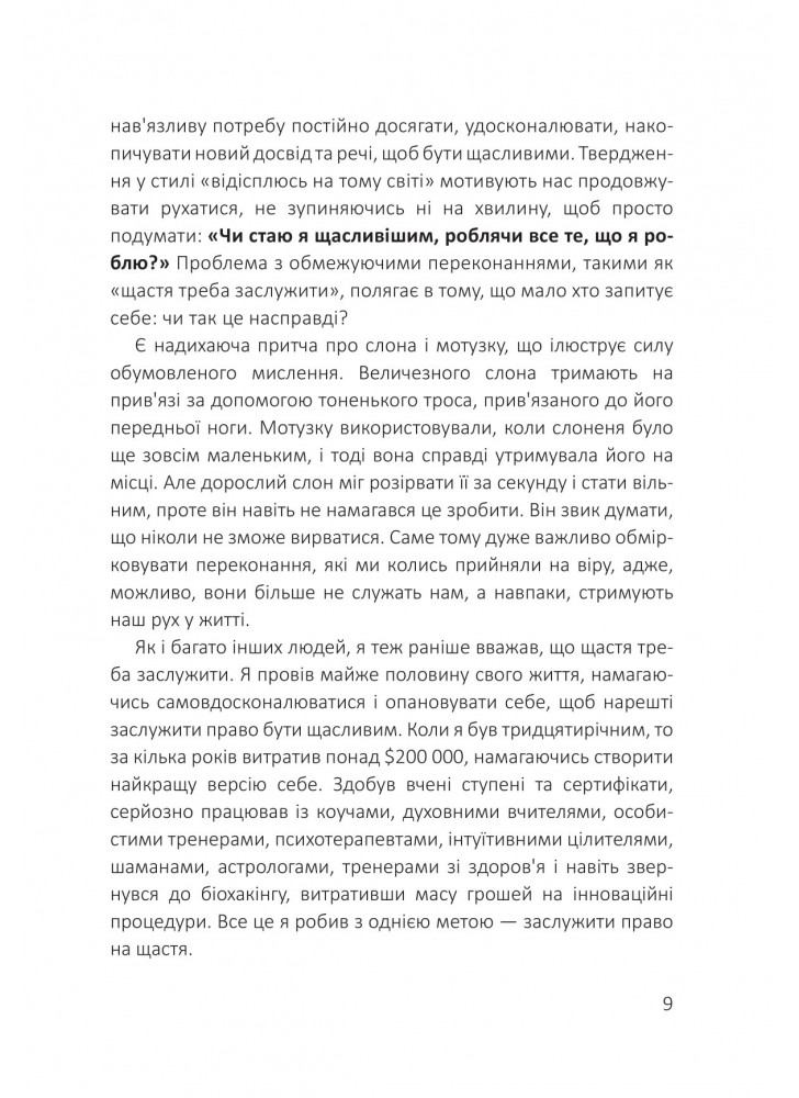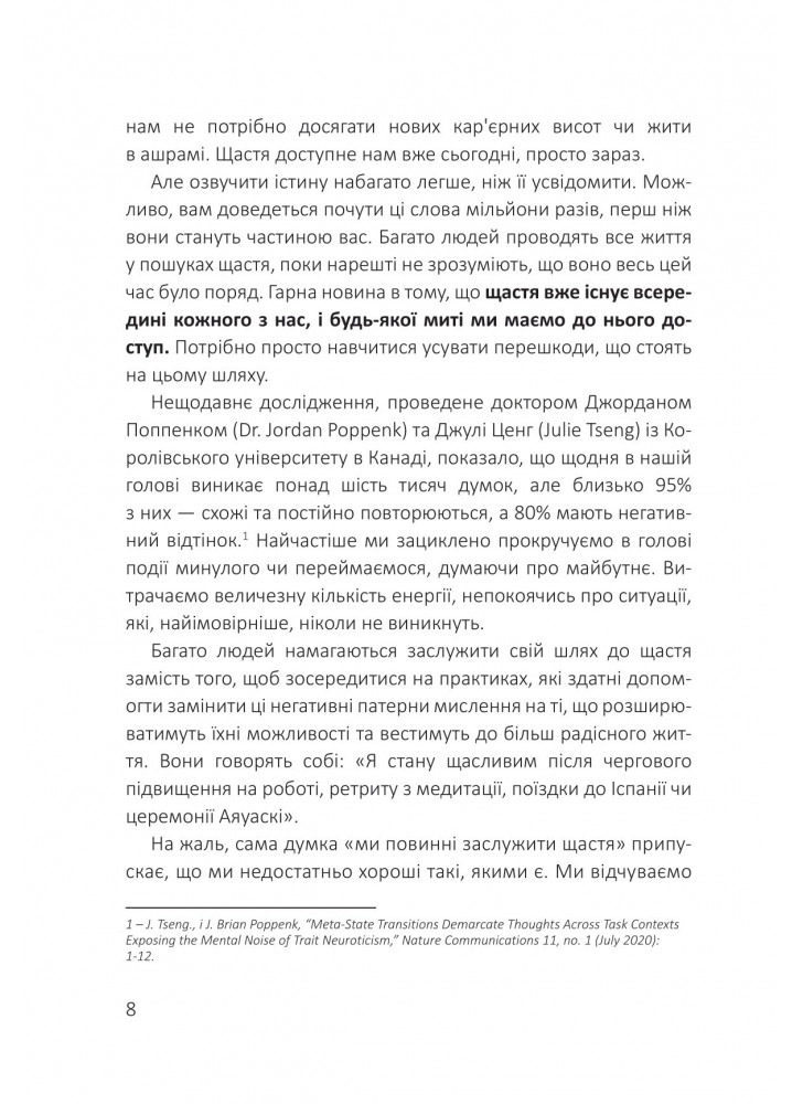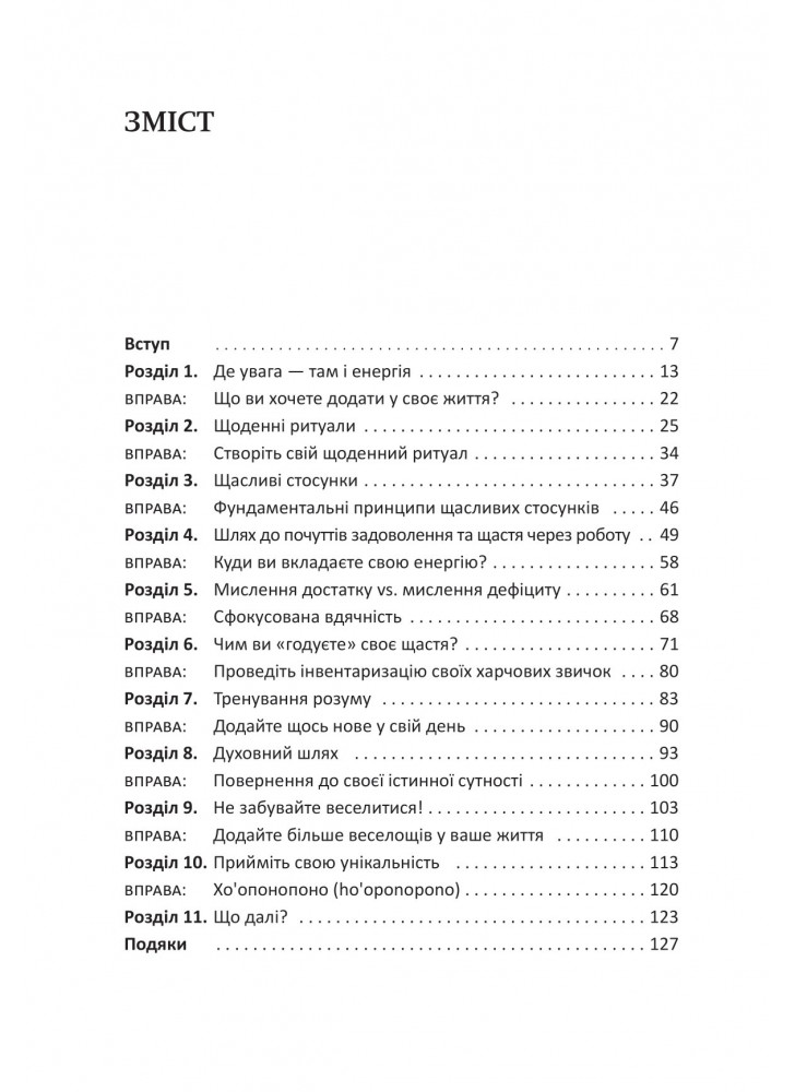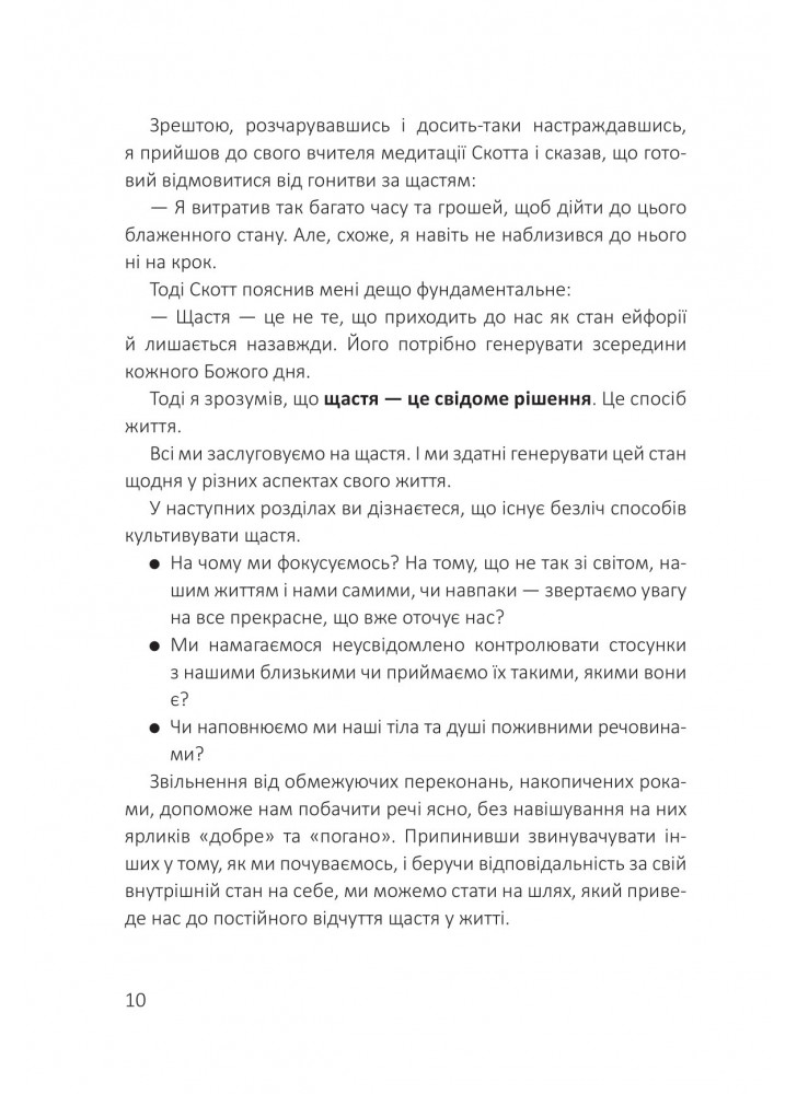 У цій книзі автор зібрав історії людей із найяскравішими прикладами життєвої трансформації, щоб показати вам, як можна реально звільнитися від умовностей, які заважають вам отримувати від життя все, що ви хочете. "Посібник зі щастя" пропонує прості стратегії для створення більш щасливих стосунків, отримання задоволення від роботи, розвитку мислення достатку та багато іншого. Завдяки легким щоденним ритуалам ви зможете постійно підтримувати свій намір жити щасливо щодня.