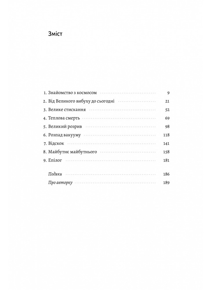 - Мак чітко структурує книжку і надає в ній 5 можливих сценаріїв кінця Всесвіту, серед яких велика криза, теплова смерть, великий розрив, вакуумний розпад та сплеск;