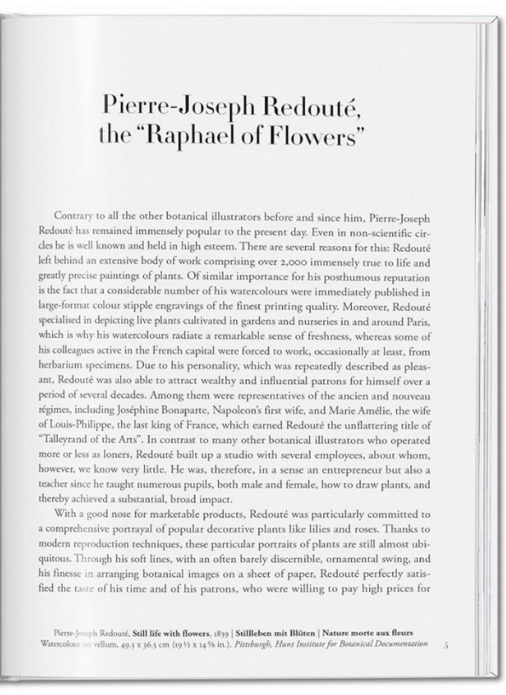 Його вражаюча колекція налічує понад 2 000 картин рослин, виконаних з "великою точністю і суворим дотриманням натури". У цьому вишуканому виданні Les Roses Редуте звертає свою увагу на "найромантичнішу, найбажанішу та найяскравішу квітку". Спочатку опублікована в трьох томах між 1817 і 1824 роками, вона залишається його найвідомішою і найуславленішою роботою.