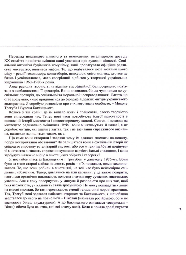 Андеграундне мистецтво України радянського періоду належить до маловідомих сторінок вітчизняної історії. Олена Голуб розповідає про художників, з якими разом брала участь у русі неофіційного мистецтва, і висвітлює біографії не визнаних за життя художників Миколи Трегуба (1943-1984) та його друга Вудона Баклицького (1942-1992).