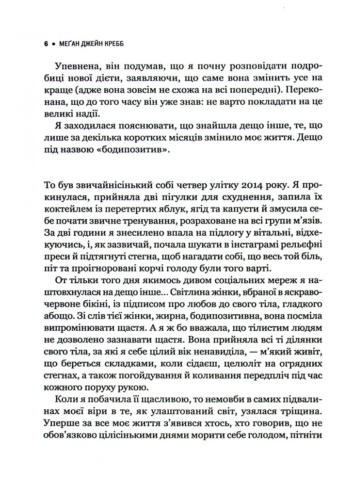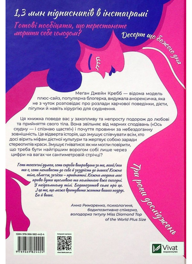 Меґан Джейн Кребб — відома модель плюс-сайз, популярна блогерка, видужала анорексичка, яка не з чуток розповідає про розлади харчової поведінки, дієти, пігулки й навіть хірургію для схуднення. Про книжку: 1,3 млн підписників в інстаграмі Три роки досліджень Десерт що божого дня