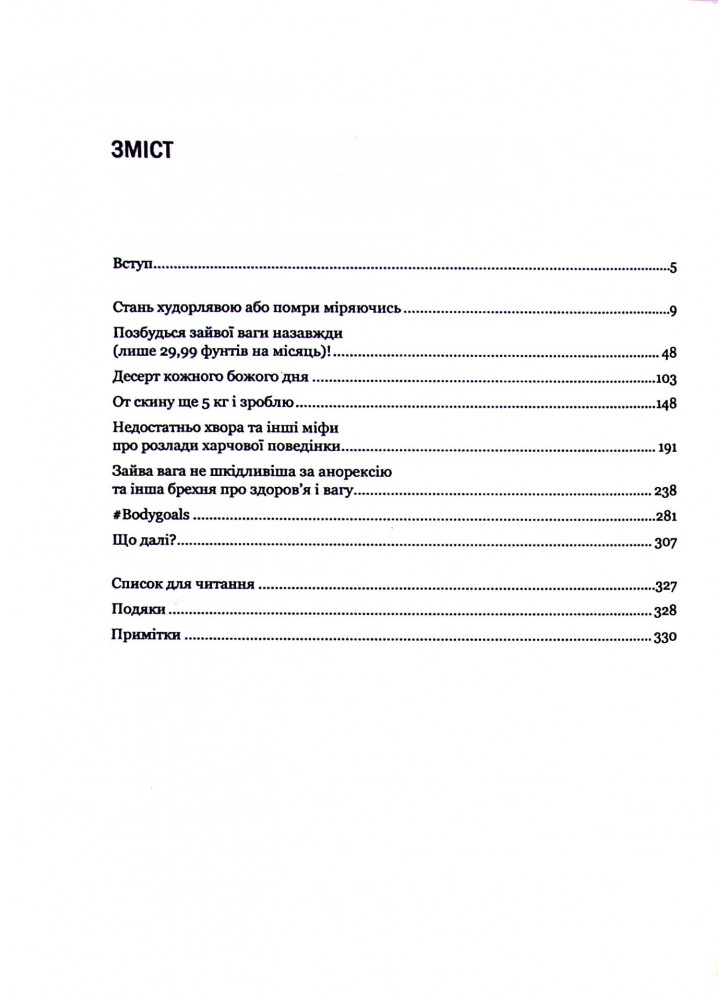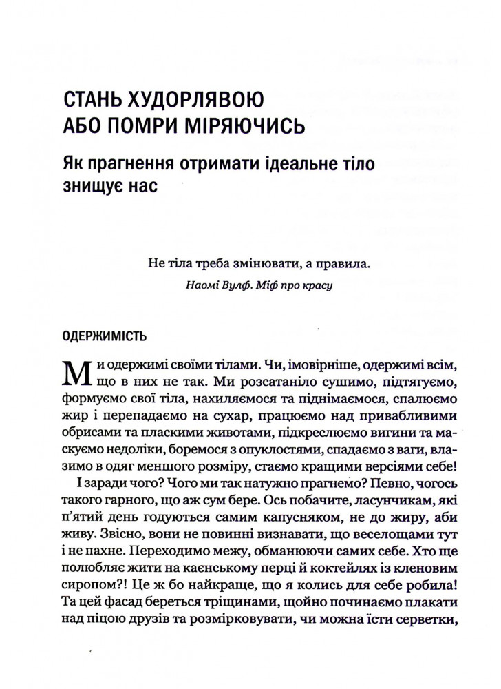 Готові пообіцяти, що перестанете морити себе голодом? Ця книжка поведе вас у захопливу та непросту подорож до любові та прийняття свого тіла. Вона звільняє від марних сподівань («Ось схудну ― і спізнаю щастя!») і почуття провини за небездоганну зовнішність. Це відверта історія, що змушує співчувати всім, хто досі вірить міфам дієтної культури та жертвує собою заради стереотипів краси. Змушує гніватися: як ми могли повірити, що треба бути найгіршим ворогом собі лише через цифри на вагах чи сантиметровій стрічці?