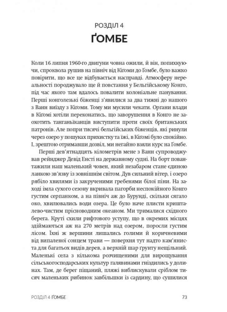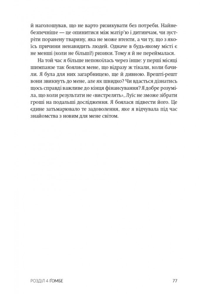 Ґудолл — видатна англійська приматологиня, найкраща світова експертка з шимпанзе. У далекому 1960-му, коли їй було двадцять шість, вона полишила Англію, щоби втілити в життя свою заповітну мрію — вивчати тварин в Африці. Без освіти та підготовки, лише з блокнотом, біноклем і любов’ю до дикої природи, Ґудолл дала світові ґрунтовні знання про найближчих родичів людини.