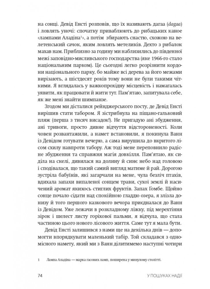 Авторка зі зворушливою щирістю розповідає про незабутній момент, коли маленький шимпанзе вперше ніжно потиснув її руку, про жах від нападу заїрських повстанців на її студентів, про смуток через смерть чоловіка. Після пів століття революційних досліджень Ґудолл переосмислює стосунки між людьми та природою й висловлює віру в те, що попри все, що відбувається з планетою, у нас усе ще є надія.