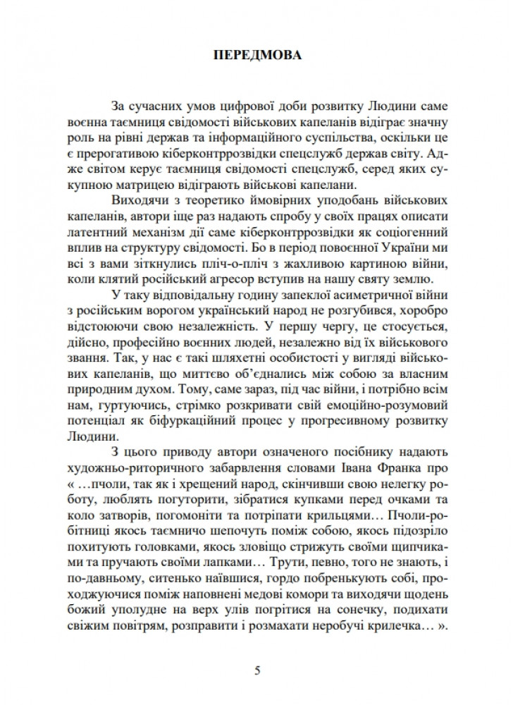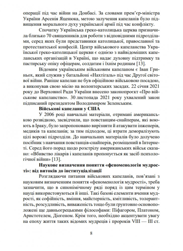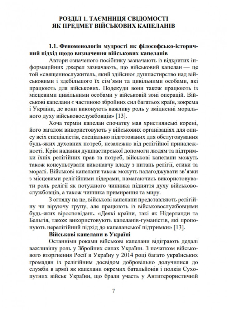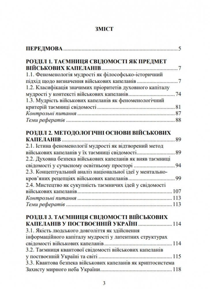 У навчальному посібнику висвітлено воєнну таємницю свідомості як людиноцентристський та людинокосмічний вимір військових капеланів щодо їх феноменології мудрості. Визначено концептуальну модель національної ідеї у ментально-кров’яних рецепціях таємниці свідомості військових капеланів.