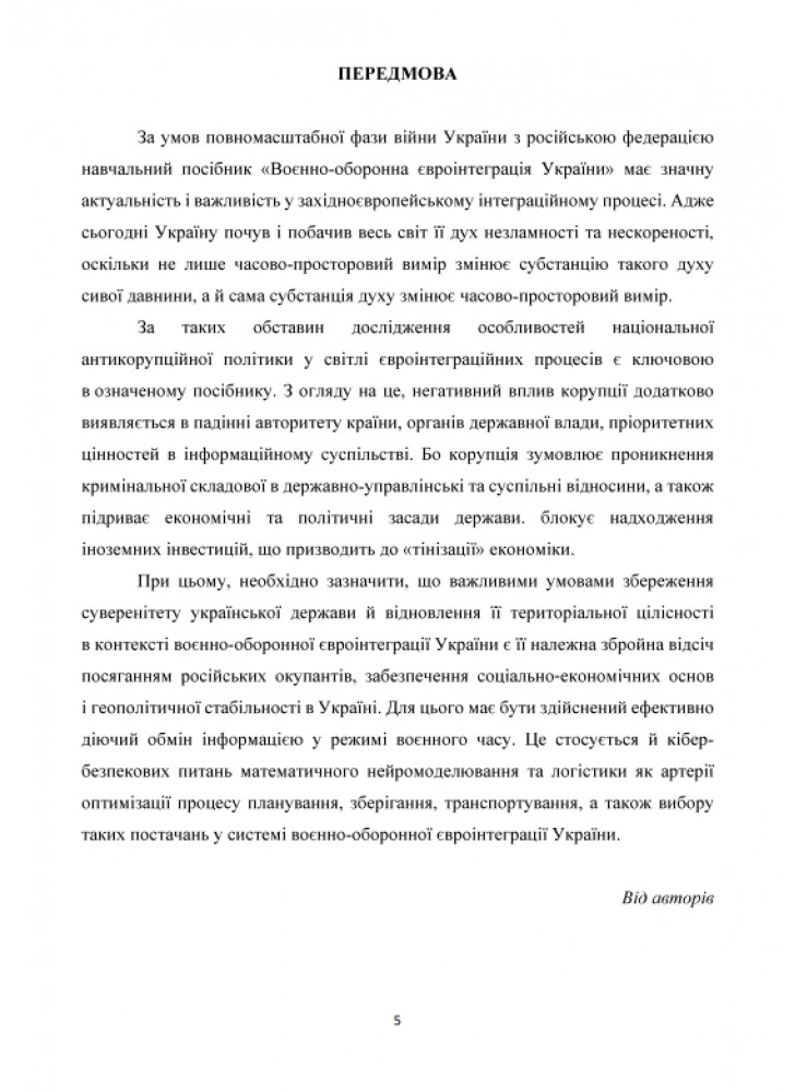 У навчальному посібнику висвітлено світоглядні настанови воєнно-оборонної євроінтеграції України. Визначено воєнно-оборонну концепцію євроінтеграції України. Стверджено основні рекомендації щодо входження України в Європейський Союз. Передбачено практичне оцінювання західноєвропейських спецслужб щодо ритмодинаміки р*сійсько-української війни. Розраховано на студентів, курсантів та викладачів вищих навчальних закладів України, а також співробітників спецслужб.