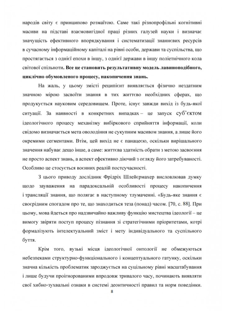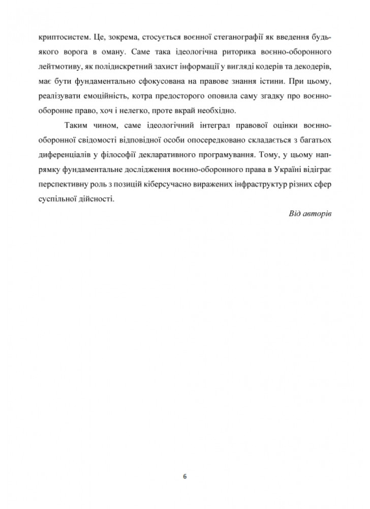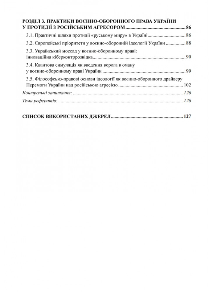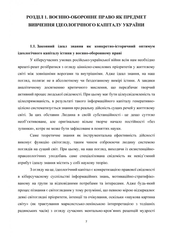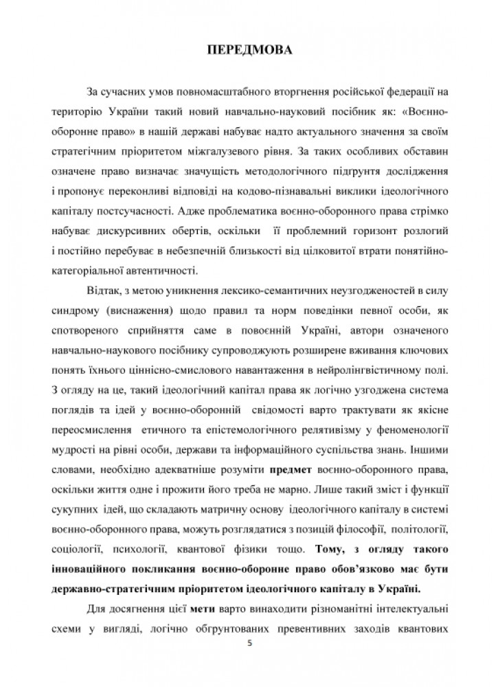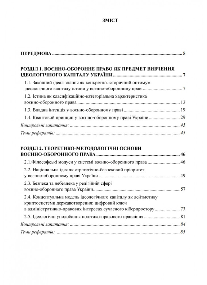 У навчально-науковому посібнику автори комплексно на міжгалузевому рівні висвітлюють воєнно-оборонне право як предмет вивчення ідеологічного капіталу в Україні. Розкрито національну ідею як стратегічно-безпековий пріоритет в ідеологічному капіталі воєнно-оборонного права. Зважено, що на законодавчому рівні внормована на практиці ідеологія непоширення руськ*го миру в Україні, зокрема православно-релігійна течія колаборантного впливу.