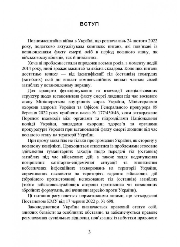 Для кращого функціонування та взаємодії спеціалізованих структур щодо встановлення факту смерті людини під час воєнного стану Міністерством внутрішніх справ України, Міністерством охорони здоров’я України та Офісом Генерального прокурора 09 березня 2022 року прийнято наказ № 177/450/46, яким затверджено Порядок взаємодії між органами та підрозділами Національної поліції України, закладами охорони здоров’я та органами прокуратури України при встановленні факту смерті людини під час воєнного стану на території України. При цьому мова йде не тільки про громадян України, як сторону у воєнному конфлікті.