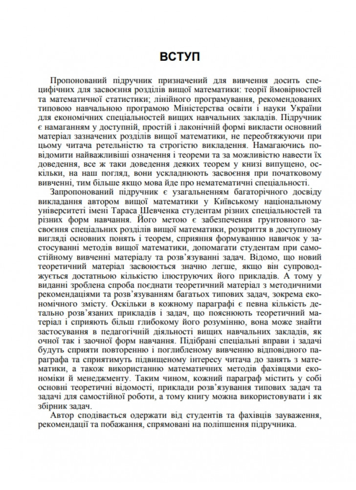 Зміст спеціальностей розділів охоплюю такі розділи вищої математики: теорію ймовірності, математичну статистику; елементи лінійної алгебри; лінійне програмування, що рекомендовані типовою навчальною програмою Міністерства освіти і науки України для економічних спеціальностей.