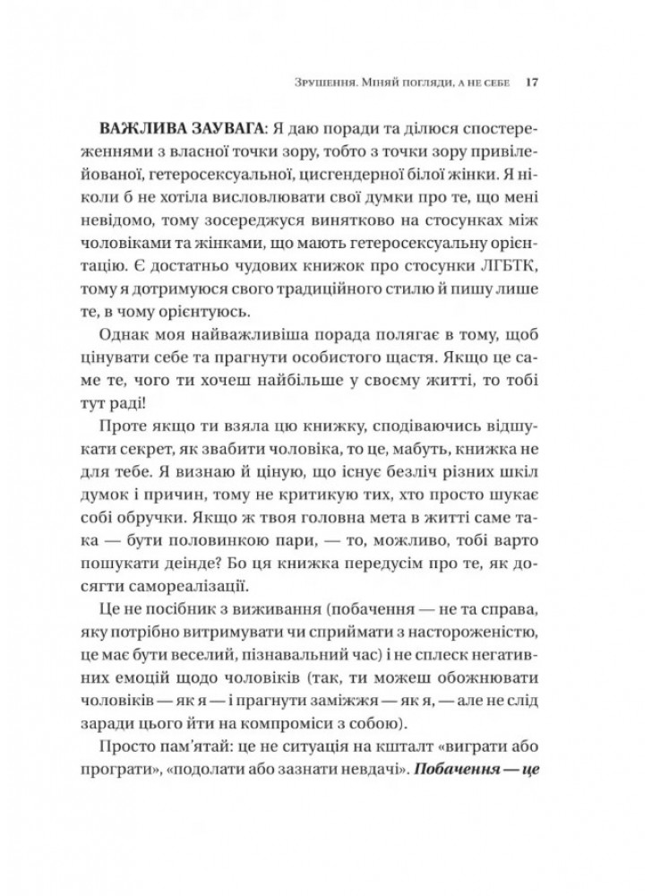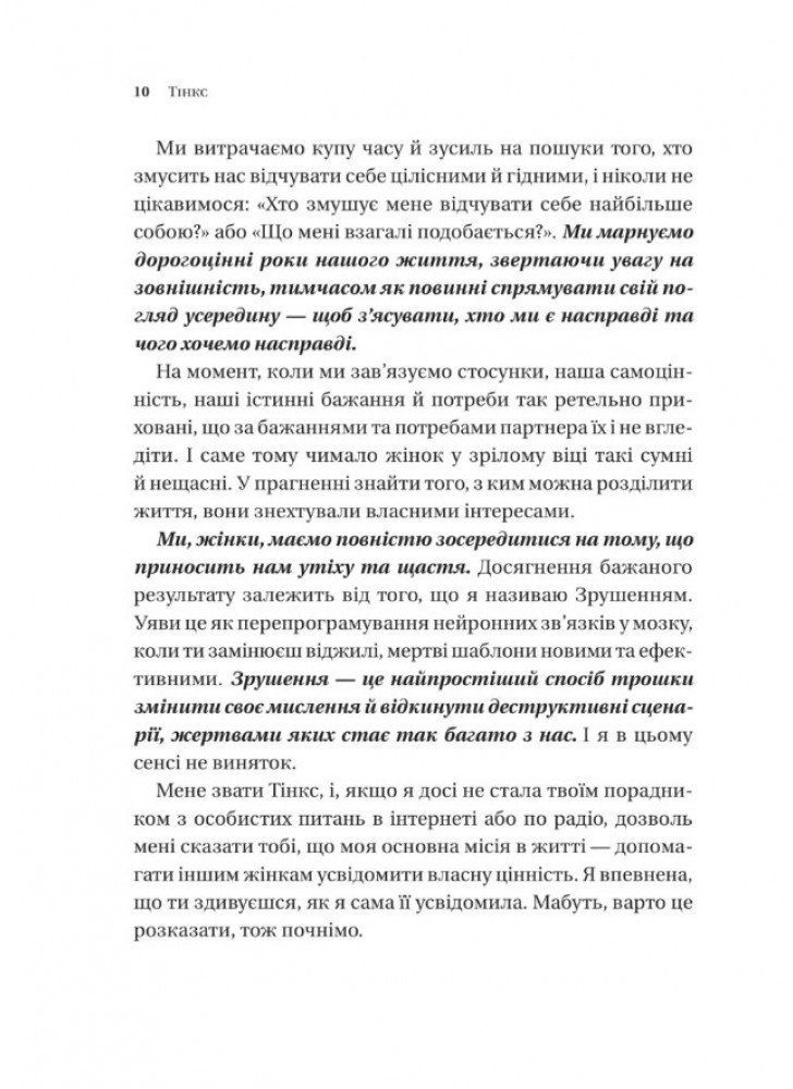 Тінкс вирішила перетворити досвід у знайомствах на ресурс для особистого розвитку. Відтак інфлюенсерка визначила, які чоловіки їй подобаються, з якими їй зручно, а які змушують почуватися невпевнено. Креативне мислення та оптимістична інтерпретація світу допомогли авторці усвідомити: вона завжди залишатиметься собою, а її внутрішня трансформація буде вмотивована тільки власними бажаннями.