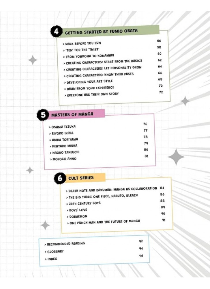 Як стати художником манги також містить спеціально створений розділ відомого японського ілюстратора Фуміо Обати, який заохочує читачів вийти за межі естетики манги та включити себе в історію, щоб розробити стиль, який є цілком оригінальним і вірним для них. Він також містить біографії відомих художників манги, визначення ключових японських термінів і список культових класичних творів, які потрібно прочитати.