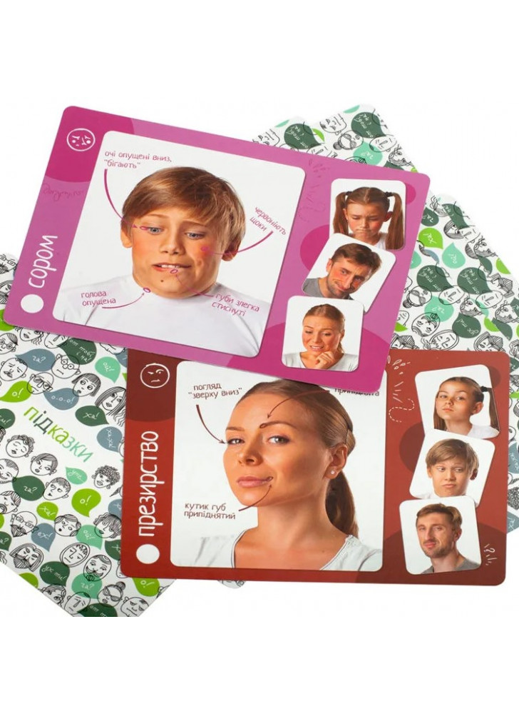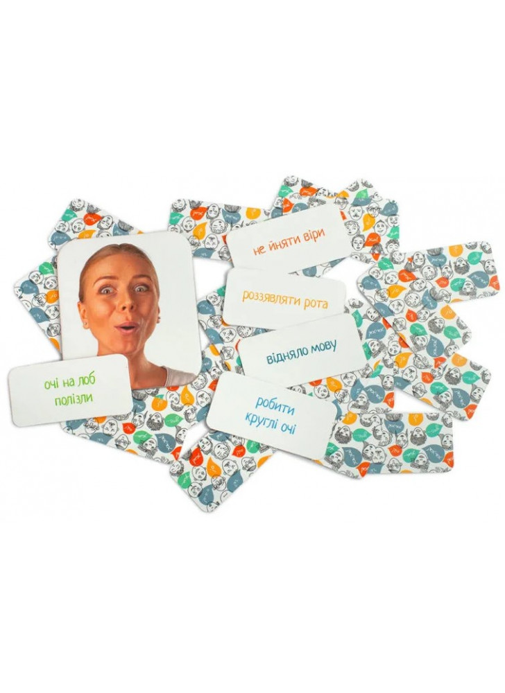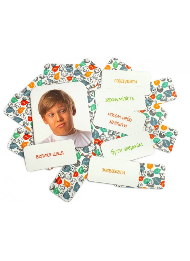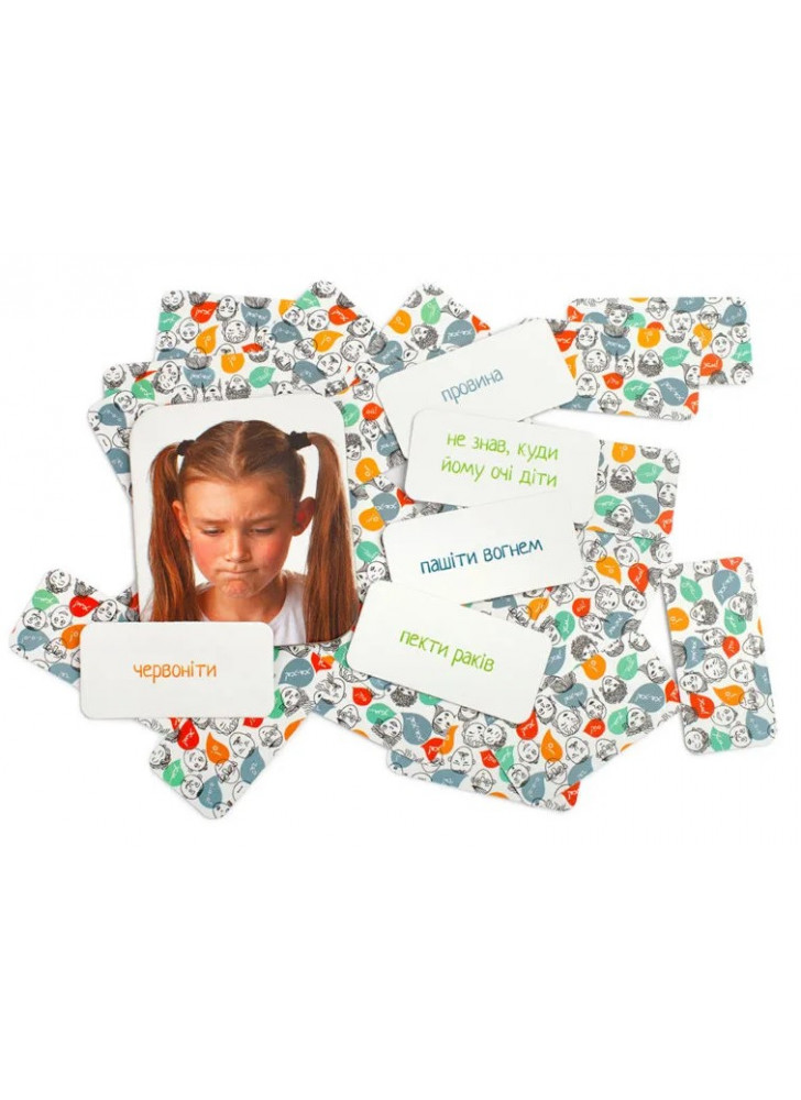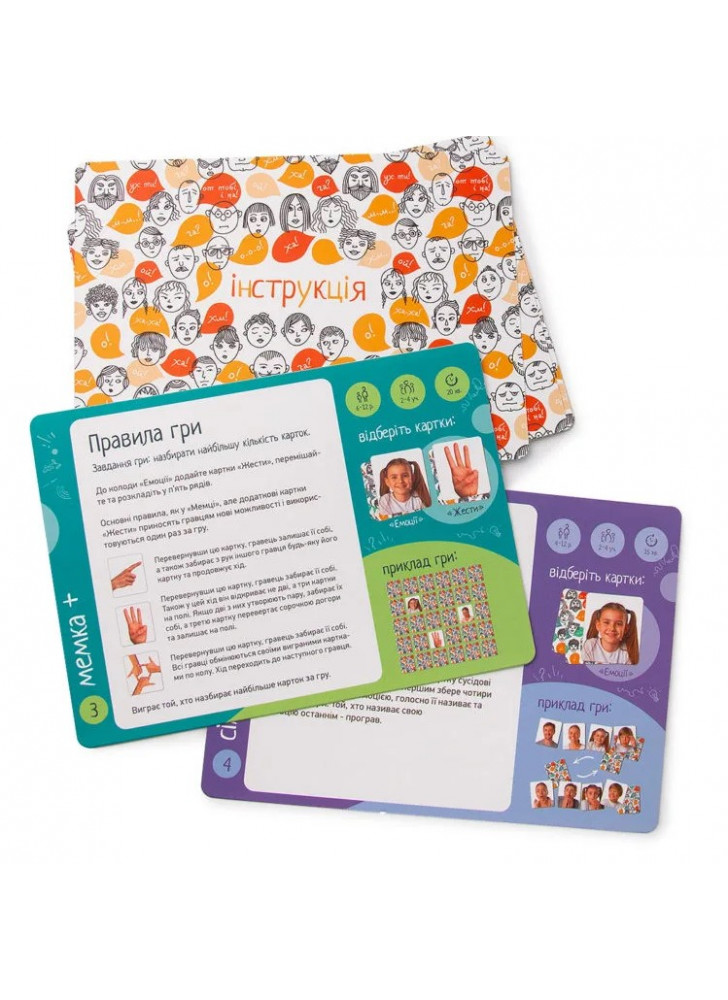 Правила для восьми ігор Картки “Емоції”- 32 шт Колода “Смайлики” – 8 шт Колода “Жести” – 6 шт Картки-пояснення – 8 шт Картки-інструкції – 10 шт Картки “Асоціації” – 28 шт Картки “Синоніми” – 80 шт