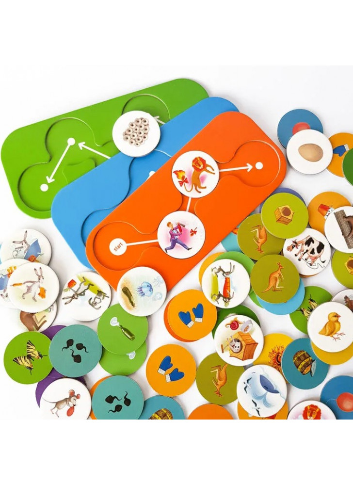 Особливості: створюйте цікаві історії та розповідайте, що було раніше та до чого призвело; вчіться відстежувати та будувати причинно-наслідкові зв’язки; використовуйте 12 планшетів з 75 кружечками з малюнками та проявіть фантазію; прості правила вам допоможуть.