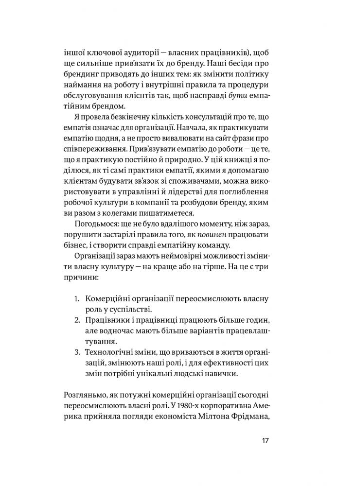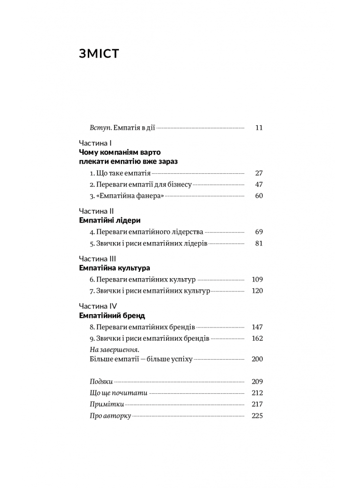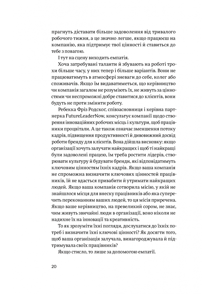 Росс демонструє, чому бізнесам варто плекати емпатію вже зараз, і ділиться звичками та рисами емпатійних лідерів, які отримують більше продуктивності й лояльності. Вона дає практичні поради щодо того, як узгодити місію організації з її цінностями і наймати потрібних людей, щоб виховувати більш емпатійну — та інноваційну — робочу культуру. Вона пояснює, як вибудувати емпатійний бренд, щоб це було щиро і проактивно, і показує, як це сприяє більшому задоволенню клієнтів, інноваційності корпоративних культур та зростанню прибутків.