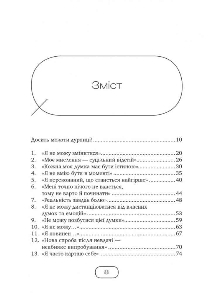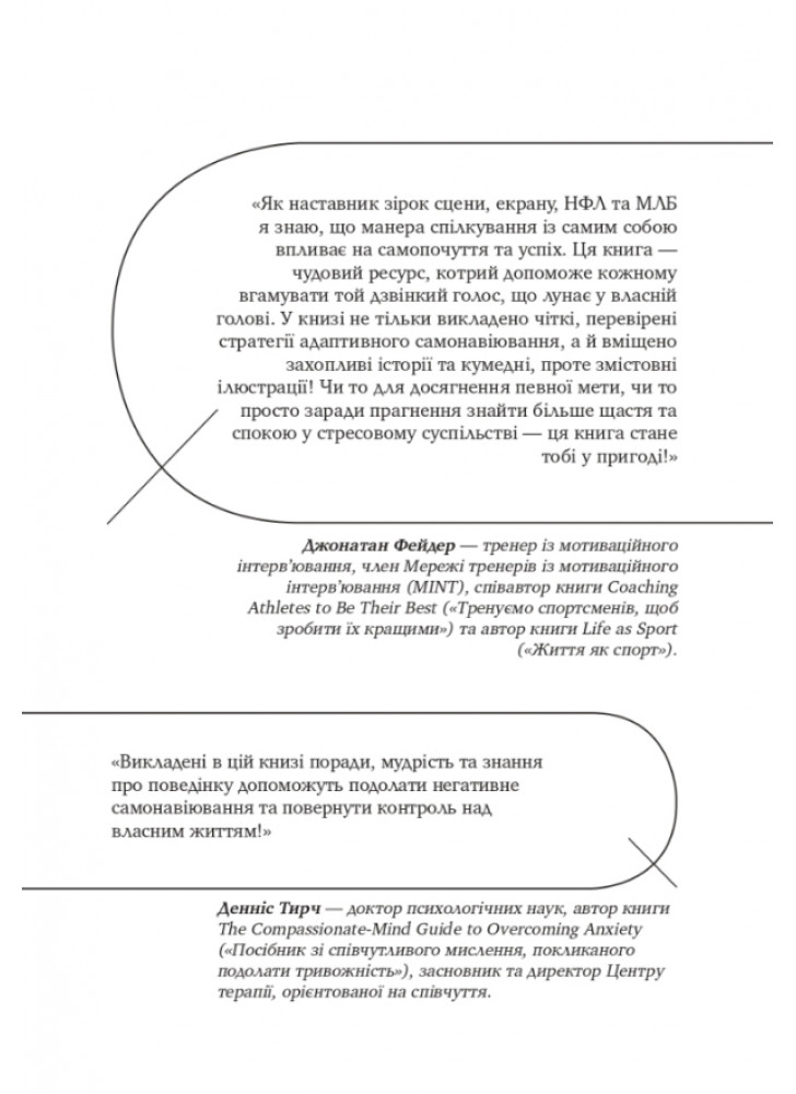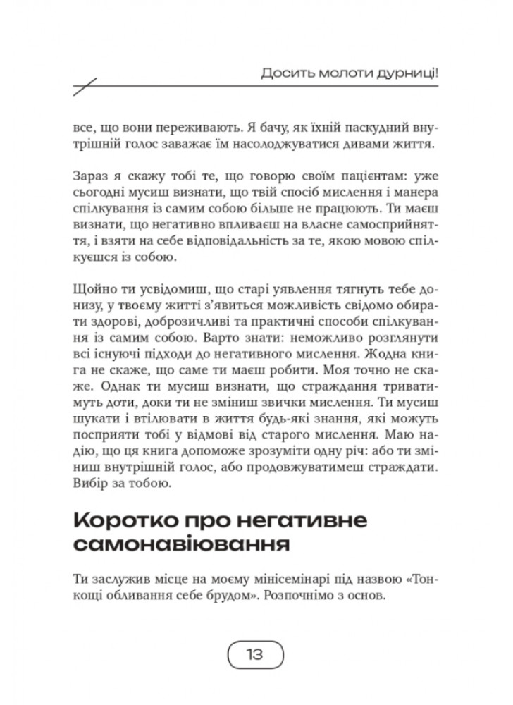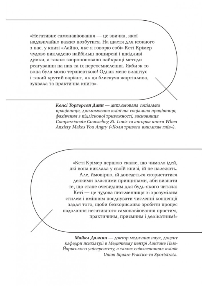 Багато людей страждає від самоїдства: постійного невдоволення собою, низької самооцінки та самозвинувачень. З часом токсичні внутрішні діалоги можуть зруйнувати впевненість у собі, стосунки з людьми, призвести до тривожності й депресій. Кеті Кример (США) пропонує 40 способів позбутися негативного самонавіювання та подолати негативну комунікацію із собою.