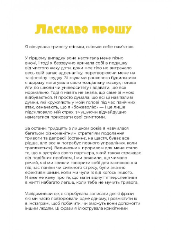 Важко знайти місце в нашому швидкоплинному світі, і легко думати, що ми єдині, хто переживає важкі часи. Як наслідок, тривога зростає. Позитивні твердження в цій книзі про тривогу у вигляді намальованих від руки чарівних тривожних монстрів допомагають упоратися з вашою тривогою там, де вона є, і пропонувати руку допомоги, щоб подолати її та досягти психічного здоров’я та душевного спокою.