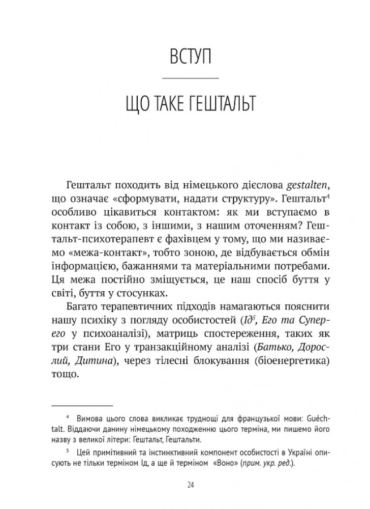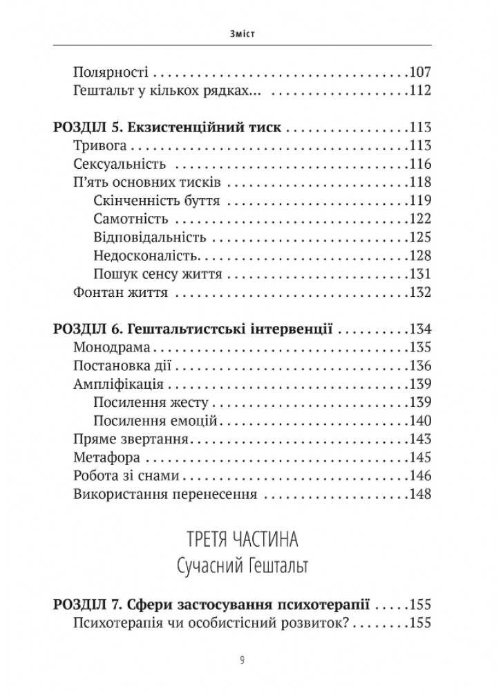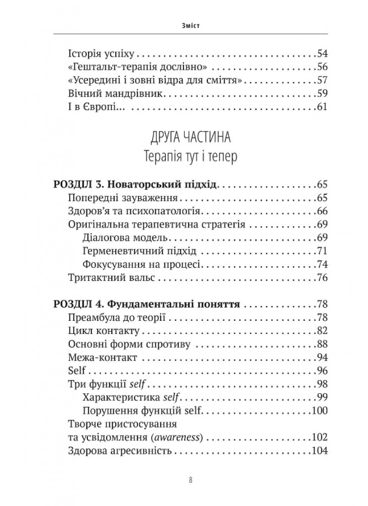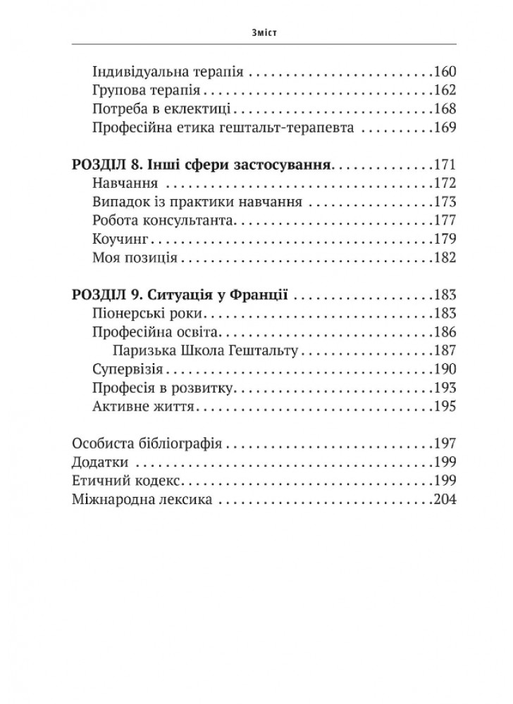 Нарешті, автор розглядає сучасні сфери застосування гештальт-підходу: не тільки індивідуальну або групову психотерапію, але й роботу в організаціях, правліннях компаній та професійну підготовку. Він надає погляд на синтез різних аспектів цієї важливої перспективи в сучасній психології.