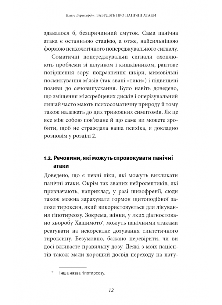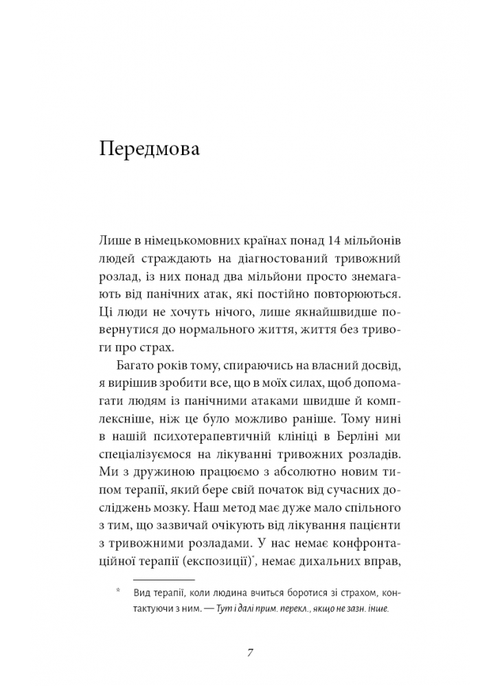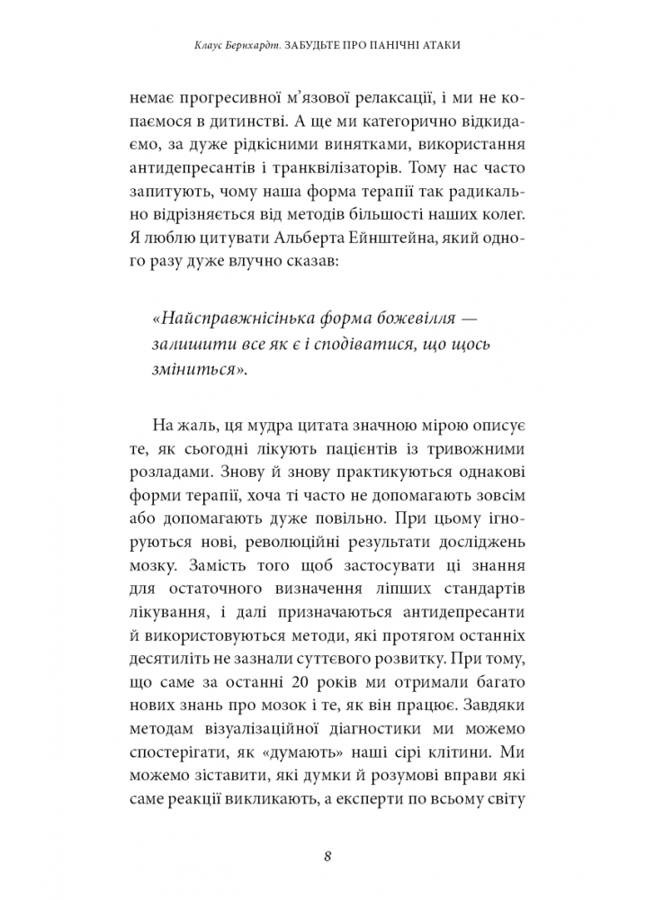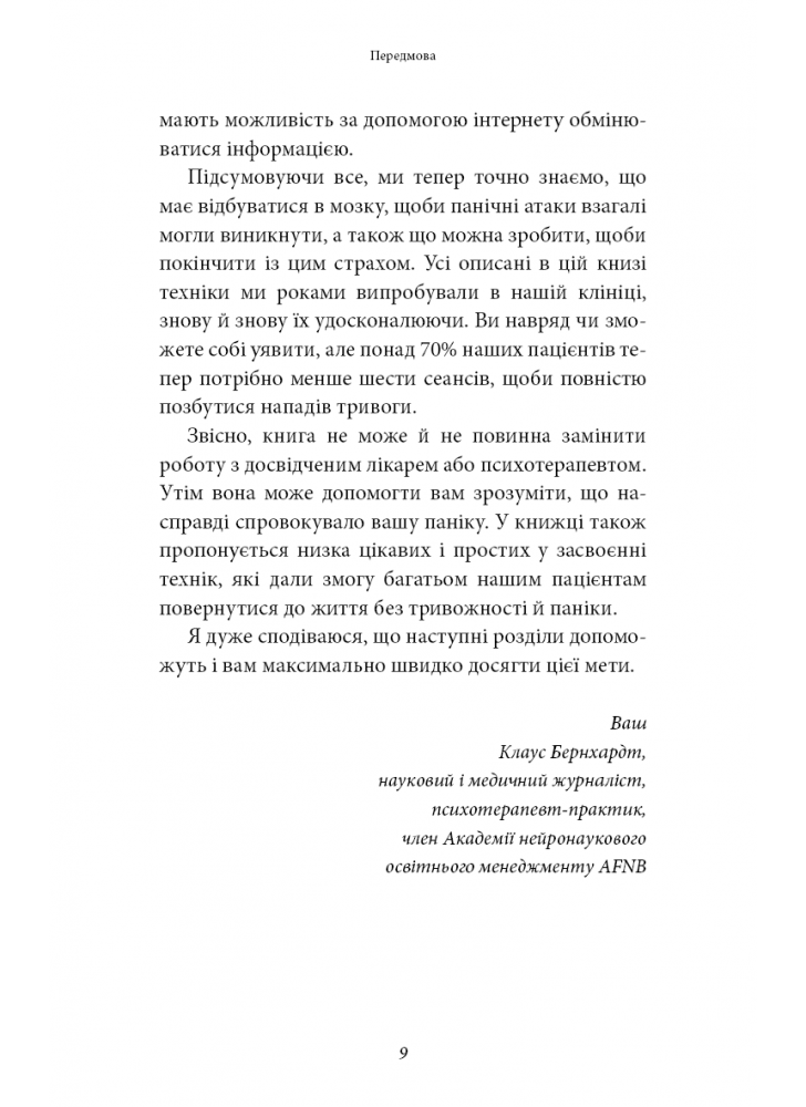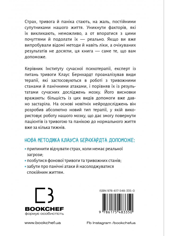 На підставі сучасних досліджень він розробив абсолютно новий тип терапії з урахуванням особливостей роботи нашого мозку, що допомагає пацієнтам із тривогою та панікою. Вправи й техніки, із якими Клаус Бернхардт знайомить читачів цієї книги, дають змогу багатьом людям повернутися до життя без страху вже за кілька тижнів.