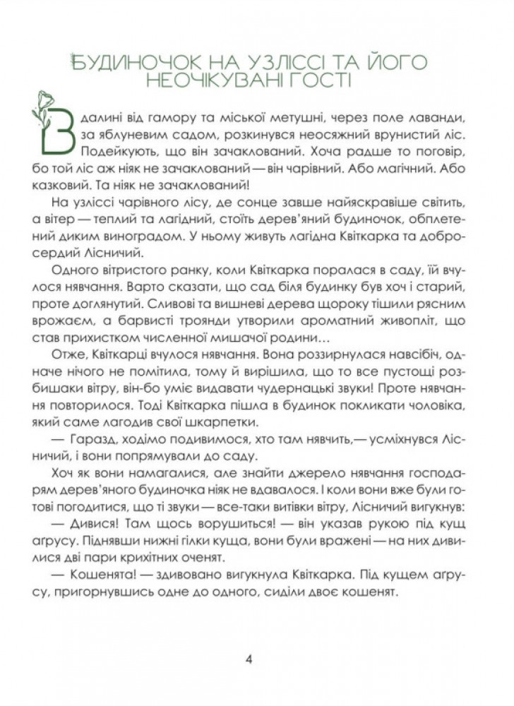 Вдалині від гамору та міської метушні, якщо перейти поле лаванди, за яблуневим садом, існує справжній чарівний ліс. Живе там лагідна Квіткарка та добросердий Лісничий, стара Знахарка, напівсобака–напіввовк Дунай, відлюдкуватий художник і ще багато інших незвичайних та добрих істот…