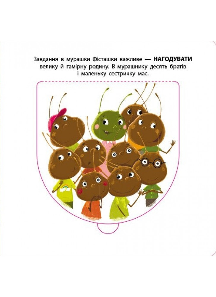 Мурашка Фісташка незвичайна комашка. Щодня у неї чимало турбот. Чим саме зайнята мурашка? Які пригоди з нею сталися? Чому вона Фісташкою називається? Скільки братів та сестер має? Про це у дотепній книжці. Відкривай великі віконечка та шукай відгадки до пригод.