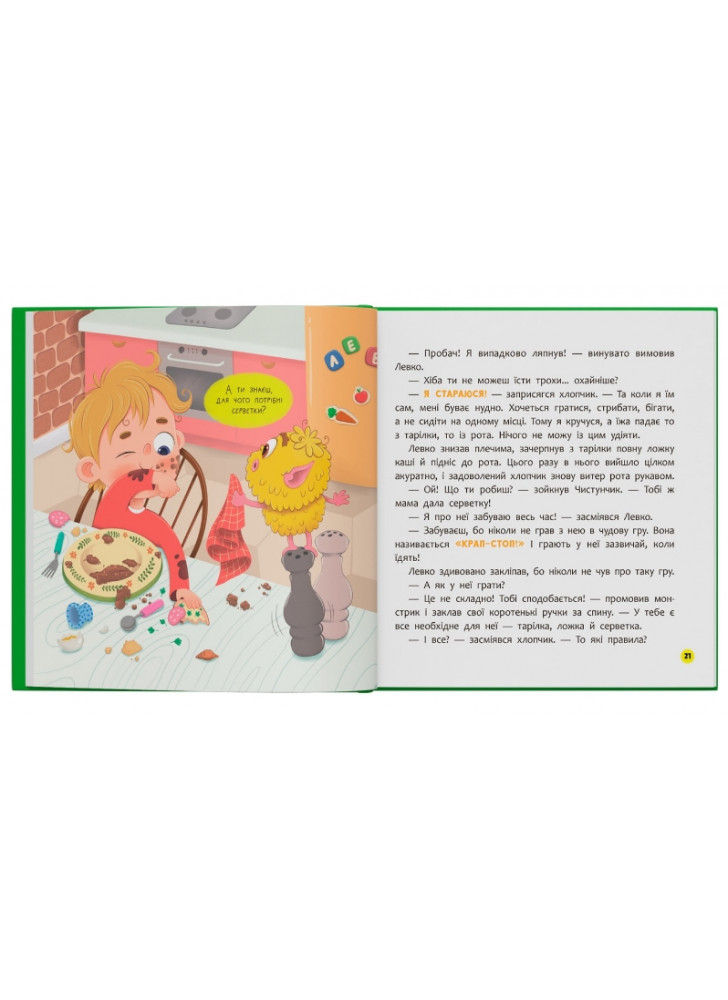 Тож монстрик вирішує допомогти Левкові зрозуміти, чому важливо бути акуратним і підтримувати порядок. Ця історія — про охайність, відповідальність і турботу. Разом з веселим монстриком маленькі читачі навчаться простих, але важливих щоденних звичок, завдяки яким легко завжди виглядати охайним і підтримувати порядок навколо.