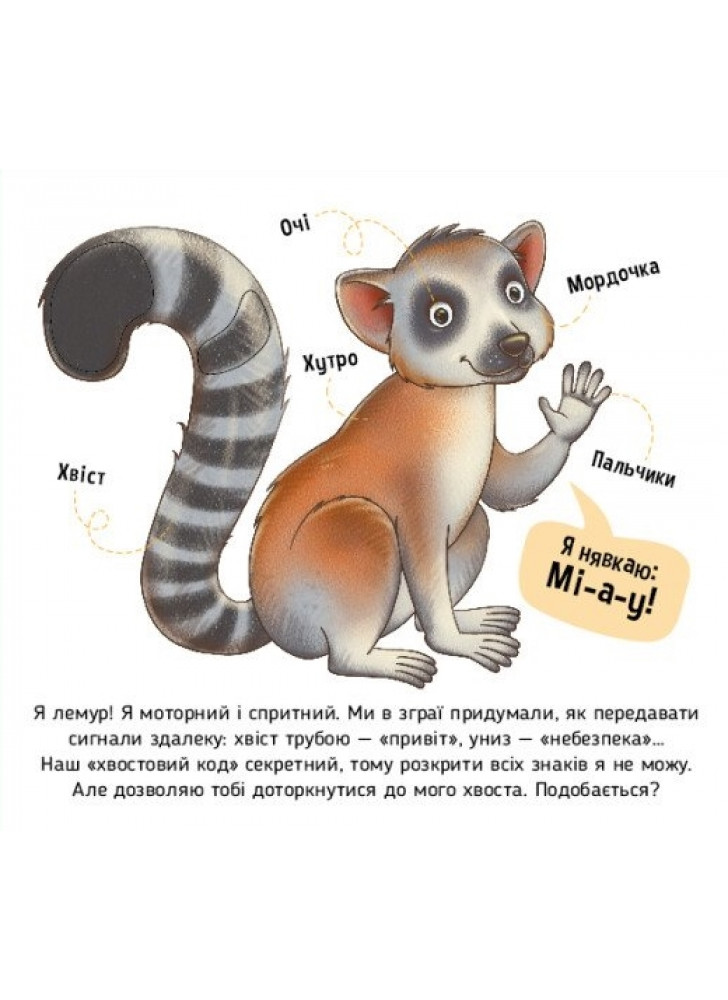 Настав час знаходити нових друзів! Тваринки, що мешкають на сторінках цієї книжки, не тільки добрі та веселі, а й… пухнасті. Кожну тваринку можна погладити і познайомитися з нею ближче. Малюк дізнається все найцікавіше про нового друга: що їсть, де живе і які має вподобання. Окрім тактильної вставки, на кожному розвороті дитину чекає таємне віконце!