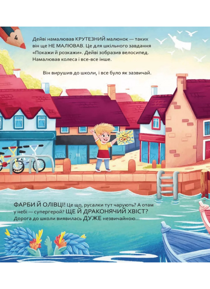 Тільки читачі можуть врятувати дітлахів із біди, а для цього треба рушити у подорож трьома чудернацькими світами… Розвиток фантазії із захопливим читанням Це був звичайний день для талановитого Дейві. Він із радістю поспішав до школи, адже для завдання «Покажи й розкажи» намалював надзвичайно крутецький велосипед, зовсім як справжній! Раптом буденний маршрут виявився повним несподіванок.