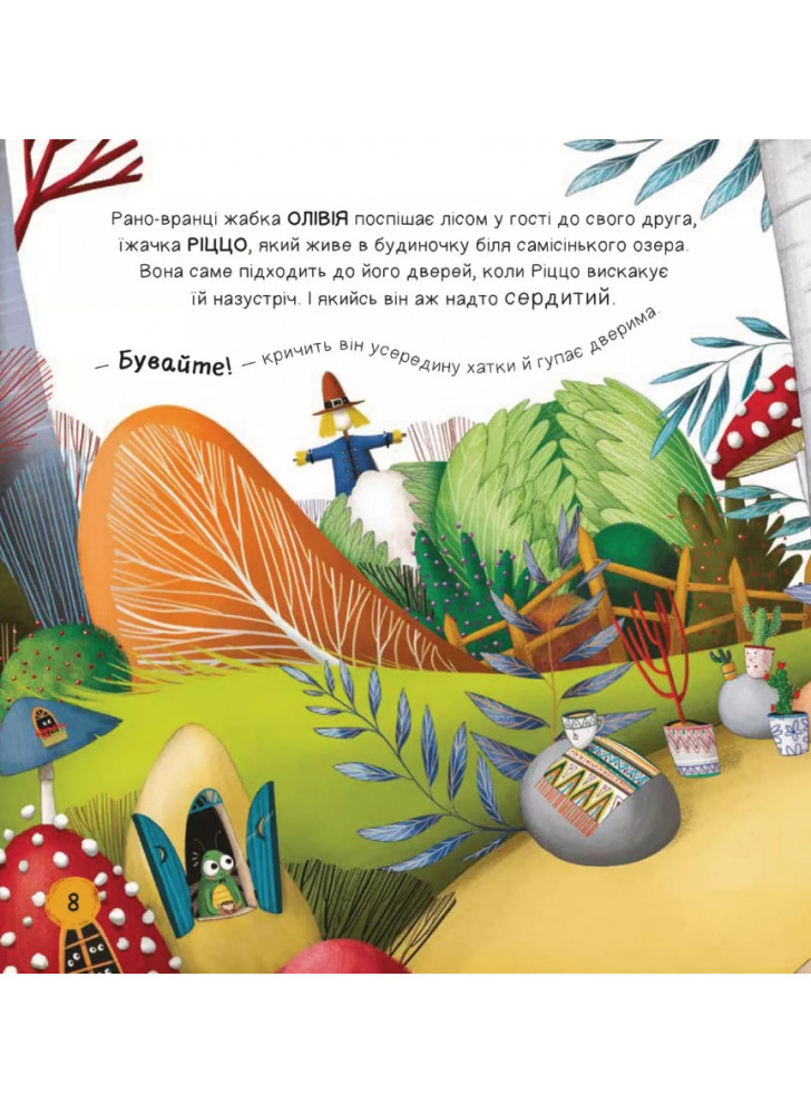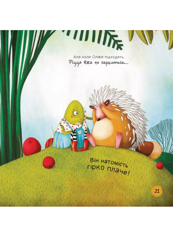 Ілюстрована книжка написана італійськими авторами сучасної дитячої літератури — Аною Серною та Енаром Ініґо — і оздоблена малюнками від художниці Касандри. На сторінках постає жабка Олівія, яка в простій формі пояснює, як позбутися негативу в спілкуванні та як справлятися зі складними ситуаціями, не вдаючись до ревнощів і маніпуляцій.