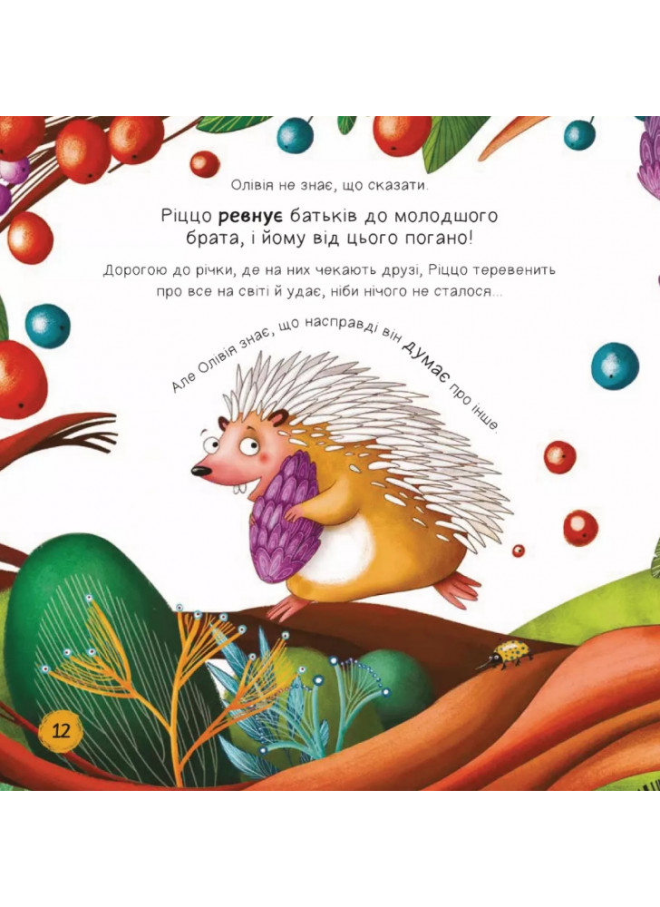 Прощавайте, ревнощі! Довіро, привіт! — це перша оповідка жабки Олівії та слова, які вона прагнула донести їжачку Ріццо. Малеча гадає, що батьки його більше не люблять! Вони приділяють увагу лише новонародженому братику, а про нього забули. Герой у розпачі: він постійно сердиться, й, видається, починає ненавидіти молодшого брата… У такому стані його знаходить Олівія, що пояснює зажуреному другу: заздрість і ревнощі лишень руйнують зсередини та заважають жити щасливо.