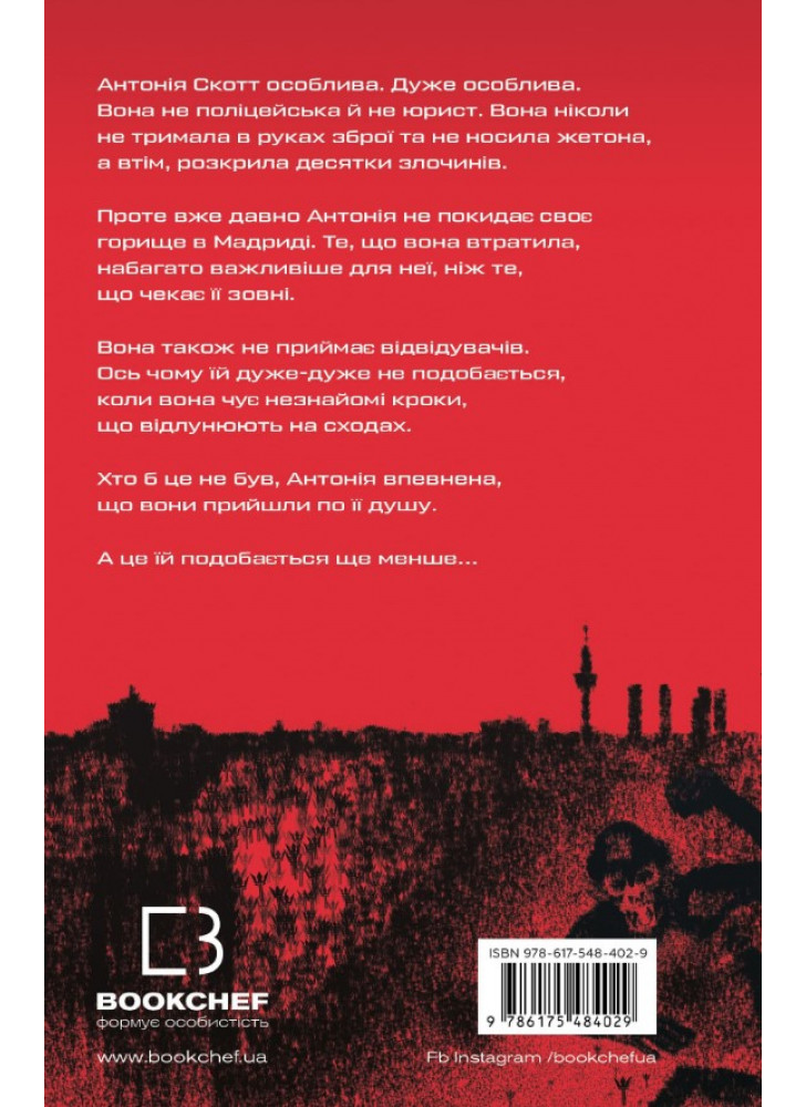 Антония Скотт особенная. Очень особенная. Она не полицейская и не юрист. Она никогда не держала в руках оружие и не носила жетона, но, впрочем, раскрыла десятки преступлений. Однако уже давно Антония не покидает свой чердак в Мадриде. То, что она потеряла, гораздо важнее для нее, чем то, что ждет ее снаружи.