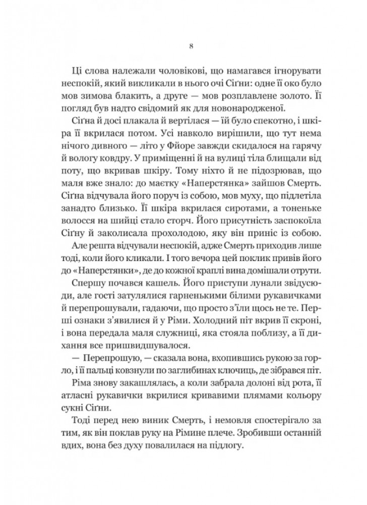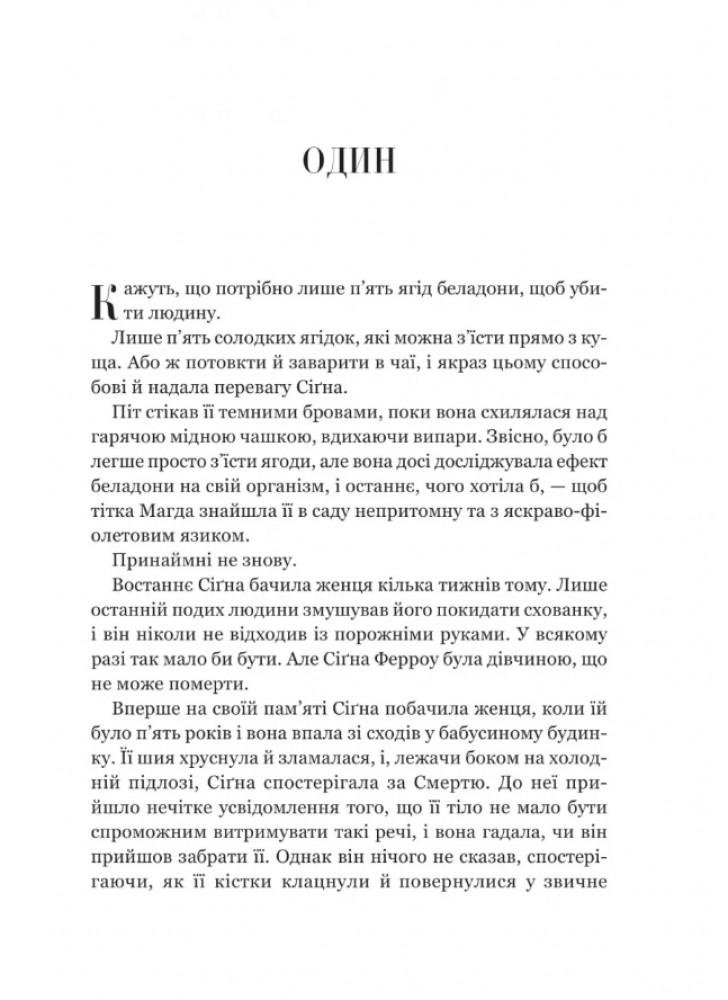 Книга «Беладонна» — це Young Adult роман, у якому американська авторка Адалін Ґрейс поєднує паранормальний детектив і готичне фентезі з незрівнянною похмурою атмосферою. Сіґна — сирота, а тому все життя переходить від одних опікунів до інших.