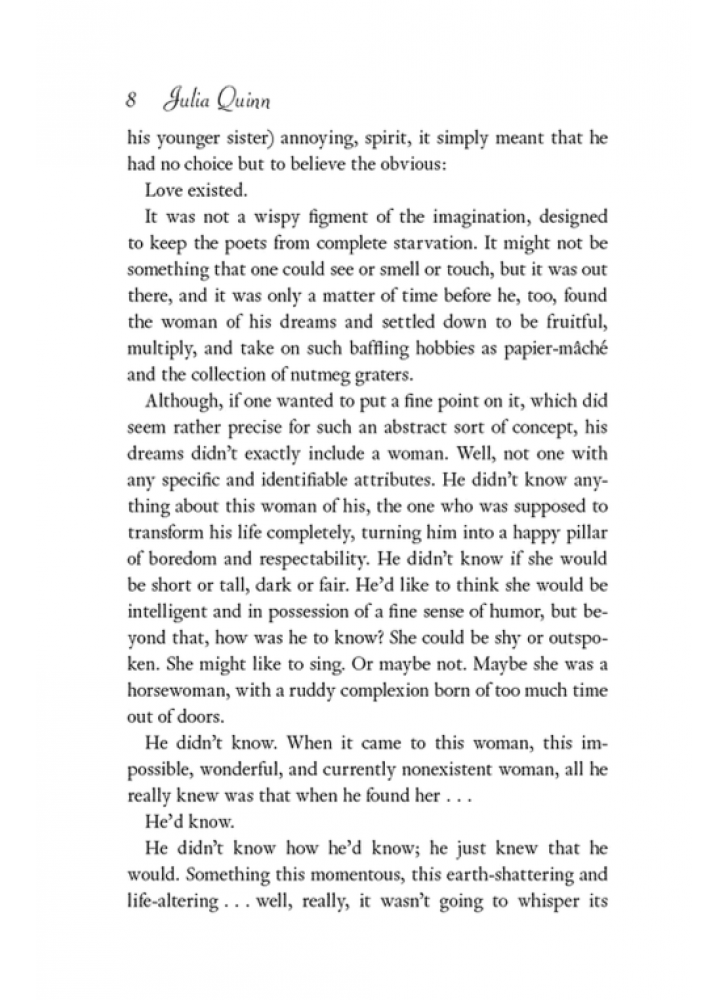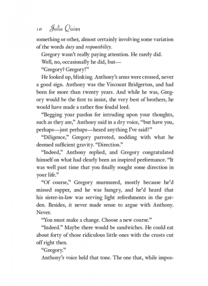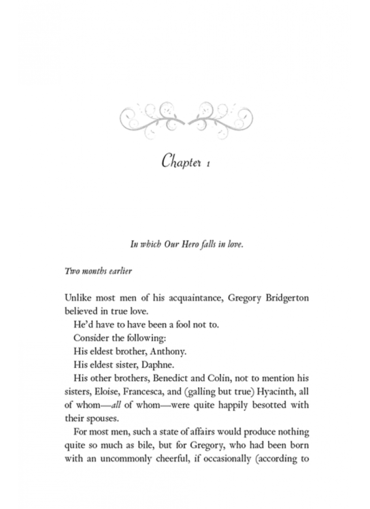 На відміну від більшості знайомих йому чоловіків, Ґреґорі Бріджертон щиро вірить у справжнє кохання. Він би мав бути дурнем, щоб не вірити: усі семеро його братів і сестер щасливо одружені. Ґреґорі переконаний, що просто чекає на свою єдину. І коли він бачить Герміону Вотсон, то відчуває всім єством: вона — його доля.