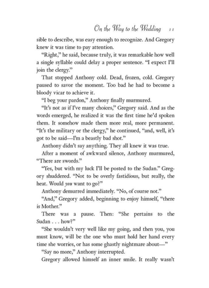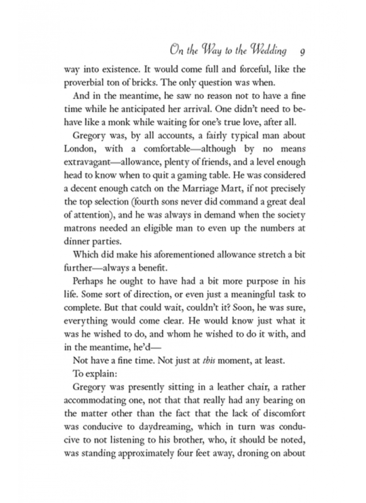 Але завдяки її найкращій подрузі — Люсі Абернеті, менш привабливій, зате дуже проникливій — Ґреґорі дізнається, що Герміона шалено закохана в іншого. І ось, коли нарешті до нього доходить, що справжня дівчина — не Герміона, а Люсі, вже запізно. Люсі має вийти заміж за іншого! Тепер — дорогою на весілля — Ґреґорі має вигадати, як зірвати церемонію і переконати Люсі, що саме він — її єдине справжнє кохання… Дізнайтеся, чому читачі так люблять Джулію Квінн…