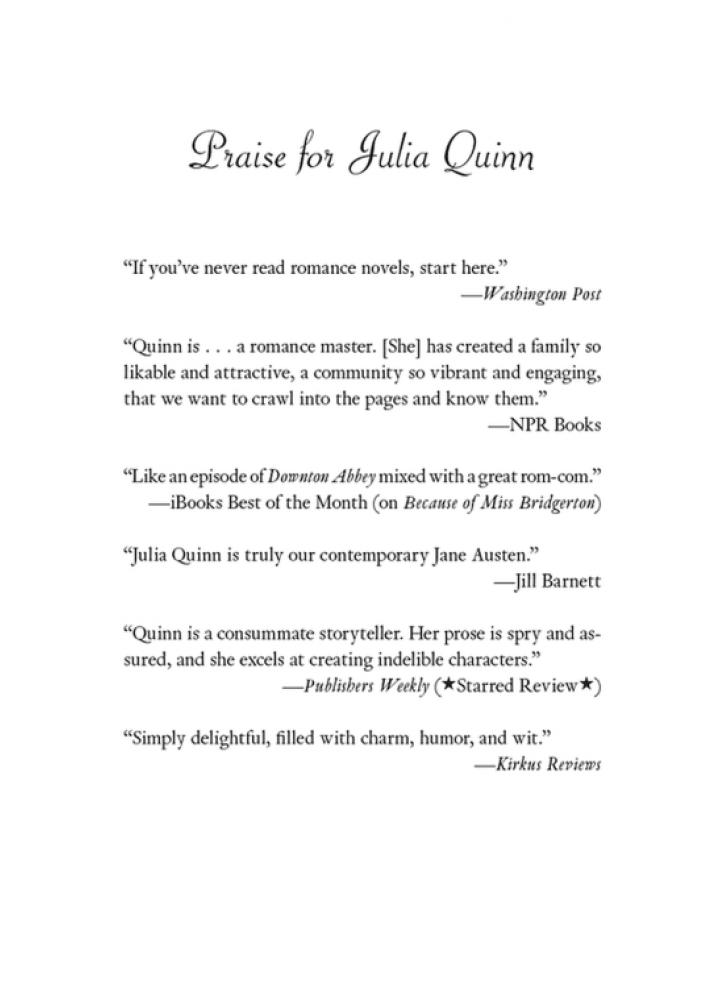 Джулія Поттінгер, більш відома під псевдонімом Джулія Куїнн — авторка бестселерів №1 за версією New York Times. Джулія любить розвіювати міфи про те, що розумні жінки не читають (або не пишуть) любовні романи, і в 2001 році вона зробила це з розмахом, з'явившись у відеоігорному шоу «Найслабша ланка» та вигравши джекпот у 79 000 доларів.