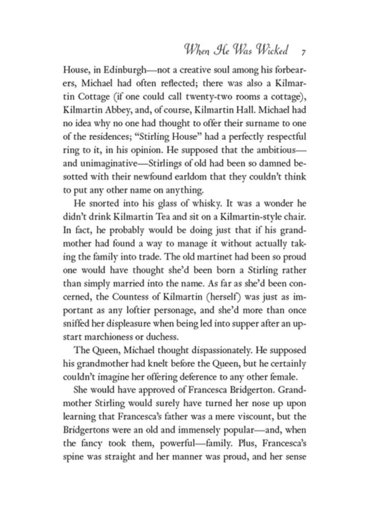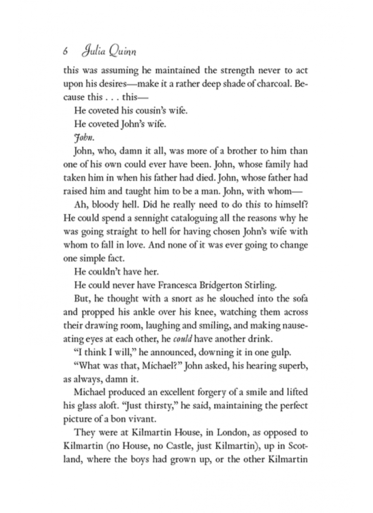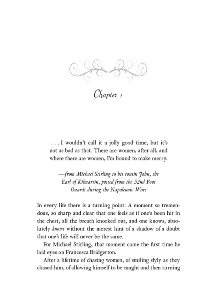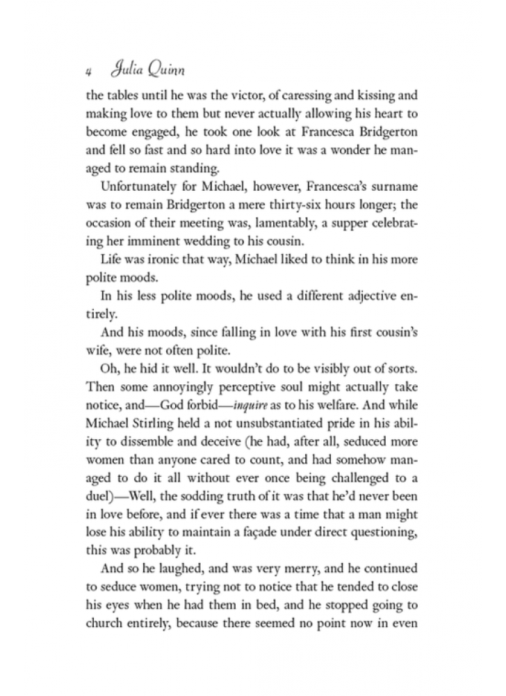 У кожному житті є переломний момент. Миттєвість настільки потужна, разюча й захоплива, що ти розумієш: відтепер усе зміниться назавжди. Для Майкла Стерлінґа, найвідомішого ловеласа Лондона, ця мить настала тоді, коли він уперше побачив Франческу Бріджертон.