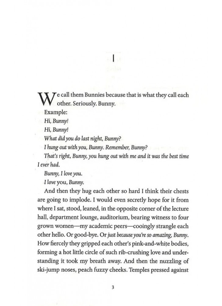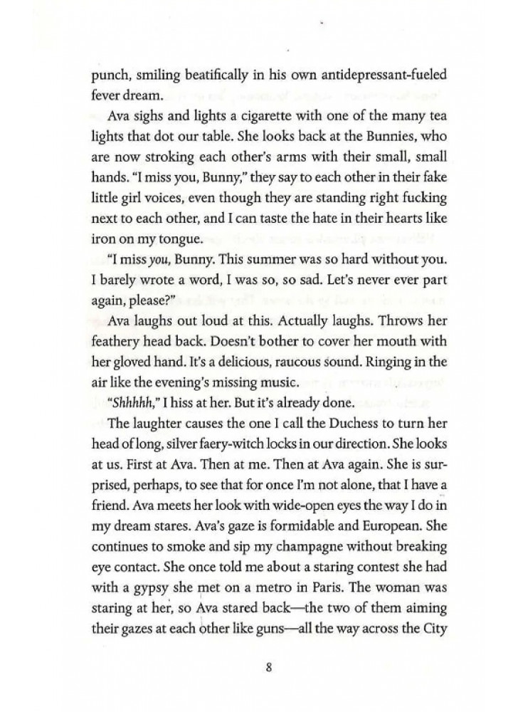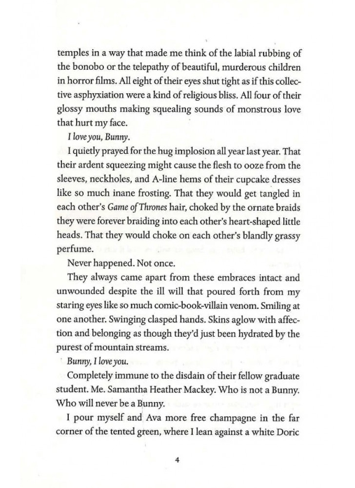 Їх називають «Кроликами», бо саме так вони звертаються одна до одної. Серйозно. «Кролик». Саманта Гізер Маккі — ізгоїня у своєму маленькому, дуже вибірковому курсі MFA в Університеті Уоррена. Власне, її цілком відштовхує решта її курсу з написання художньої літератури — кліка нестерпно вишуканих багатих дівчат, які називають одна одну «Кролик».