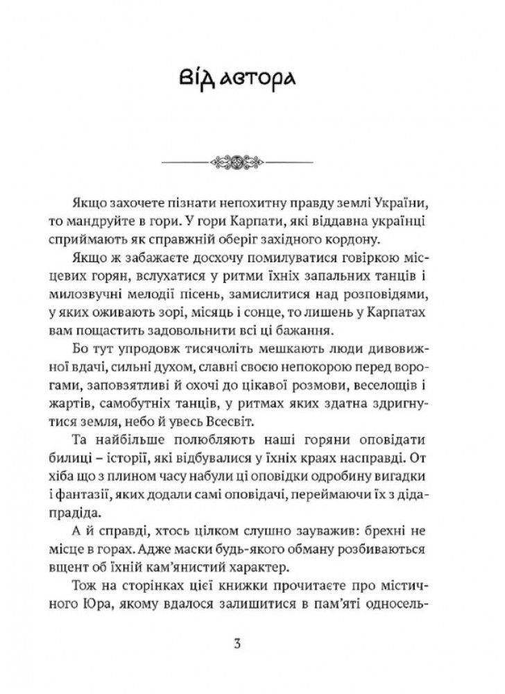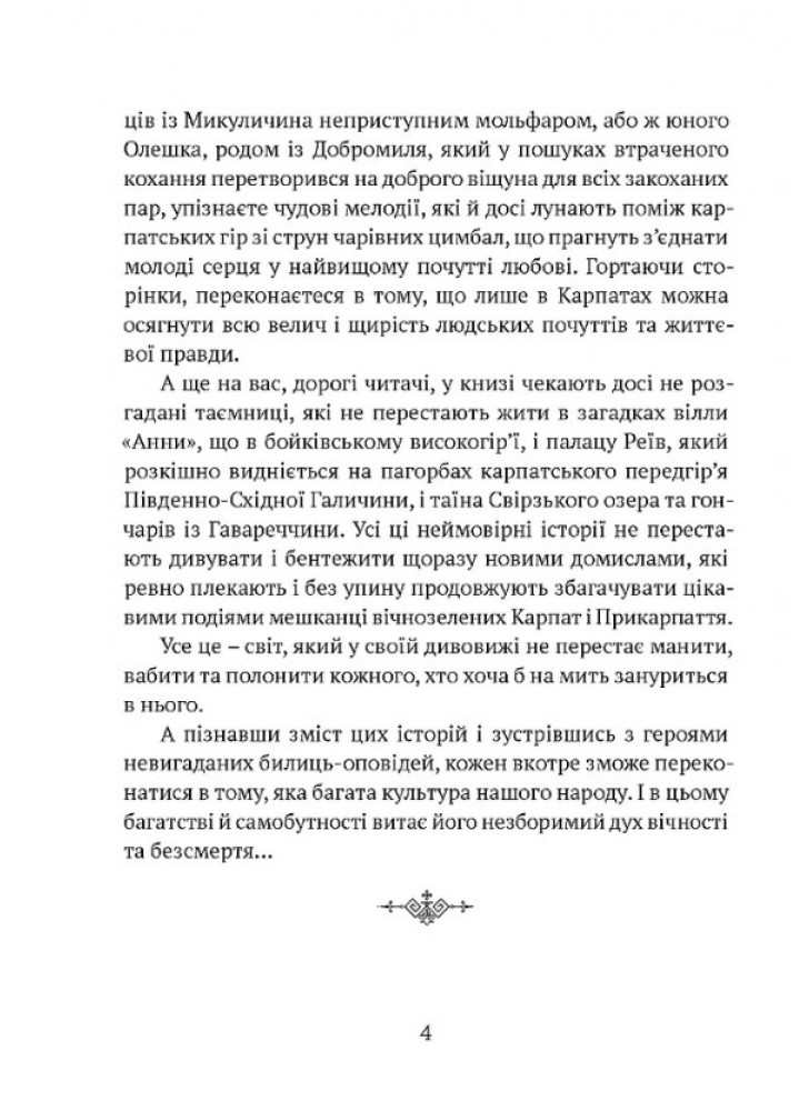 Карпатский край, издавна считавшийся оазой преданий, легенд и былин, предстает в книге как живописный уголок Украины, в котором до сих пор живут люди, наделенные невероятными возможностями, красотой, силой и мужеством. Увлекательные истории любви, победы за счастье, мистические тайны и неожиданные открытия, борьба с коварством и злом, которую ведут персонажи рассказов, нередко получают неожиданное решение.