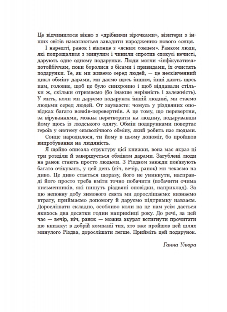 Різдво — це не лише безтурботне чарівне свято, коли лунають колядки й пахне імбирним печивом. Це — диво, що чекає на нас у найтемніші часи. І хай воно іноді примарне й незбагненне, й геть не таке, на що ми сподівалися. Але воно стається попри втрати й біди — диво, що дарує надію, пробуджує очікування й теплі спогади. Це тиша, що лягає снігом на плечі, голоси, які лунають із дитинства.