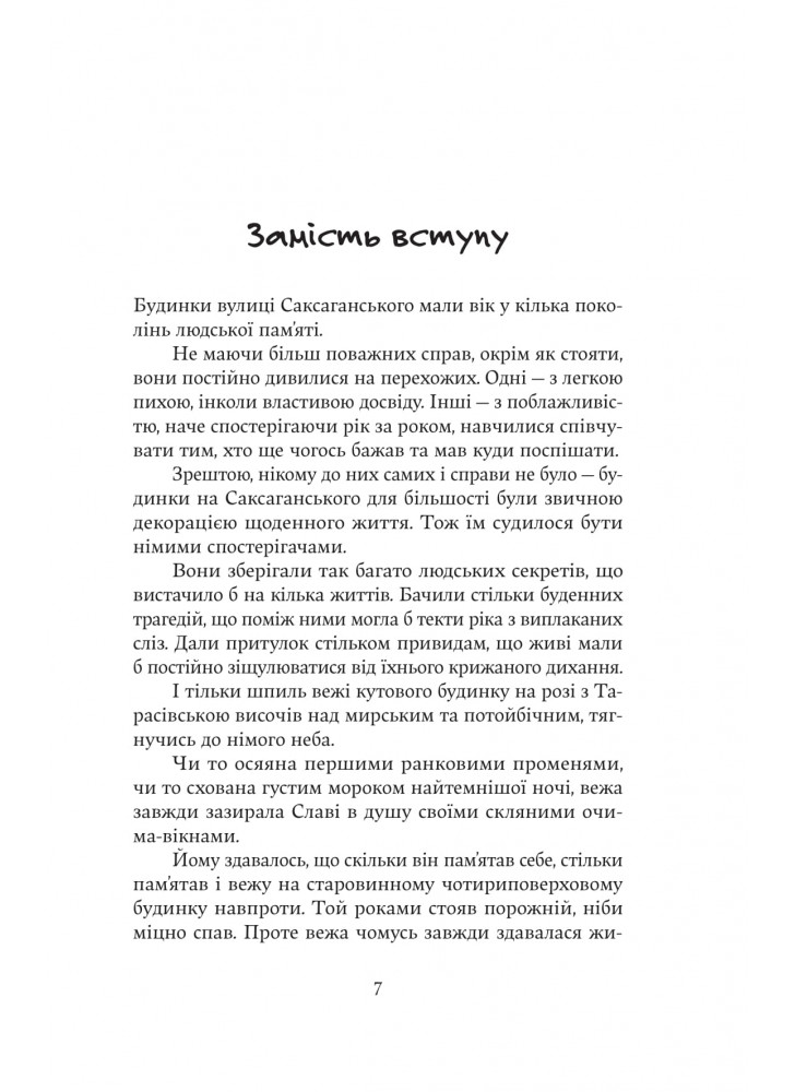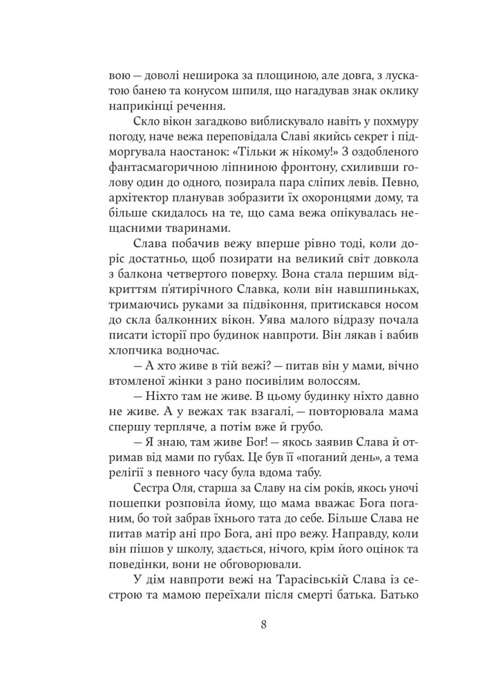 Наши дни. Киев переживает ракетные обстрелы, воздушные тревоги, идет страшная война. Главный герой, потерявший ногу на войне, находит дневник с описанием кровавых событий революционного 1918, когда Киев захватили бoльшевики, и пытается разгадать тайну старого дома с башней. Удастся ли ему? Преодолит ли свет тьму, а жизнь – смерть? В романе современного украинского автора настоящее переплетается с прошлым, а реальность — с иллюзией. Увлекательный и неординарный сюжет никого не оставит равнодушным.
