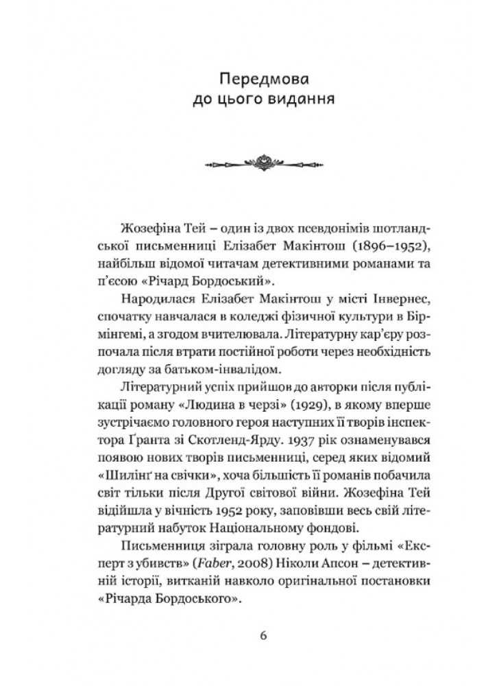 Не секрет, что лицо человека отражает его характер и поступки. А если то, что вы видите, диаметрально противоположно тому, что о человеке говорят? Поверите своей интуиции или молве? Герой романа Жозефины Тей детектив Алан Грант временно прикован к постели и изнывает от скуки. Ему случайно попадает в руки изображение человека, которого он «посадил бы в кресло судьи».