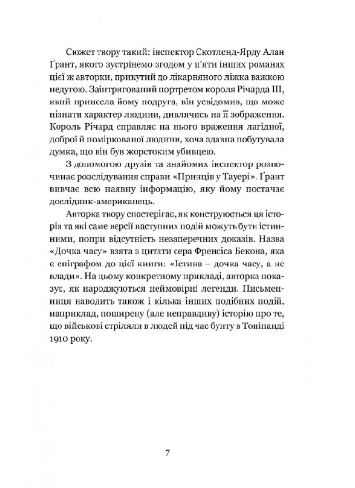 Прочитав на обороте, что это – портрет Ричарда ІІІ, Грант озадачен. Ведь всем из школьных лет известно, что этот король убил двух своих племянников. Не мог же он так ошибиться! Алан Грант начинает расследование. Его как детектива интересуют только факты. Но «свидетели» противоречат друг другу. Историю пишут победители, а истина – «дочка времени». Итак, кто прав: детектив или несомненный авторитет – «святой» Томас Мор?