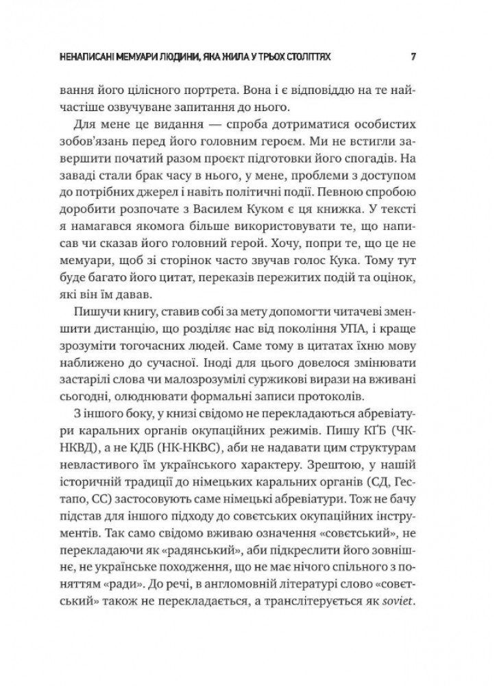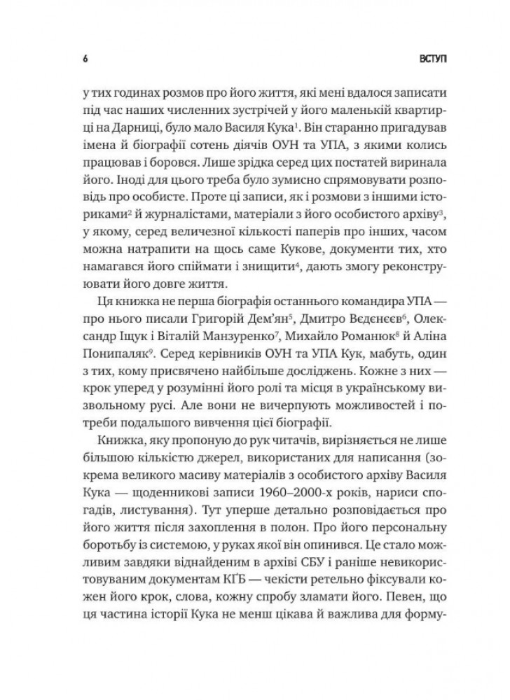 У виданні представлені матеріали з особистого архіву Василя Кука: нариси спогадів, листування та щоденникові записи 1960–2000-х років. Фотодокументи надано Центром досліджень визвольного руху та Галузевим державним архівом Служби безпеки України. Володимир В'ятрович вшановує головнокомандувача УПА, описуючи його особисту боротьбу із с*вєтською системою та вплив діянь Василя Кука на розвиток українського національного руху. Попри те, що ця книга не є мемуарами, автор прагнув сповна розкрити постать останнього командира Української повстанської армії.